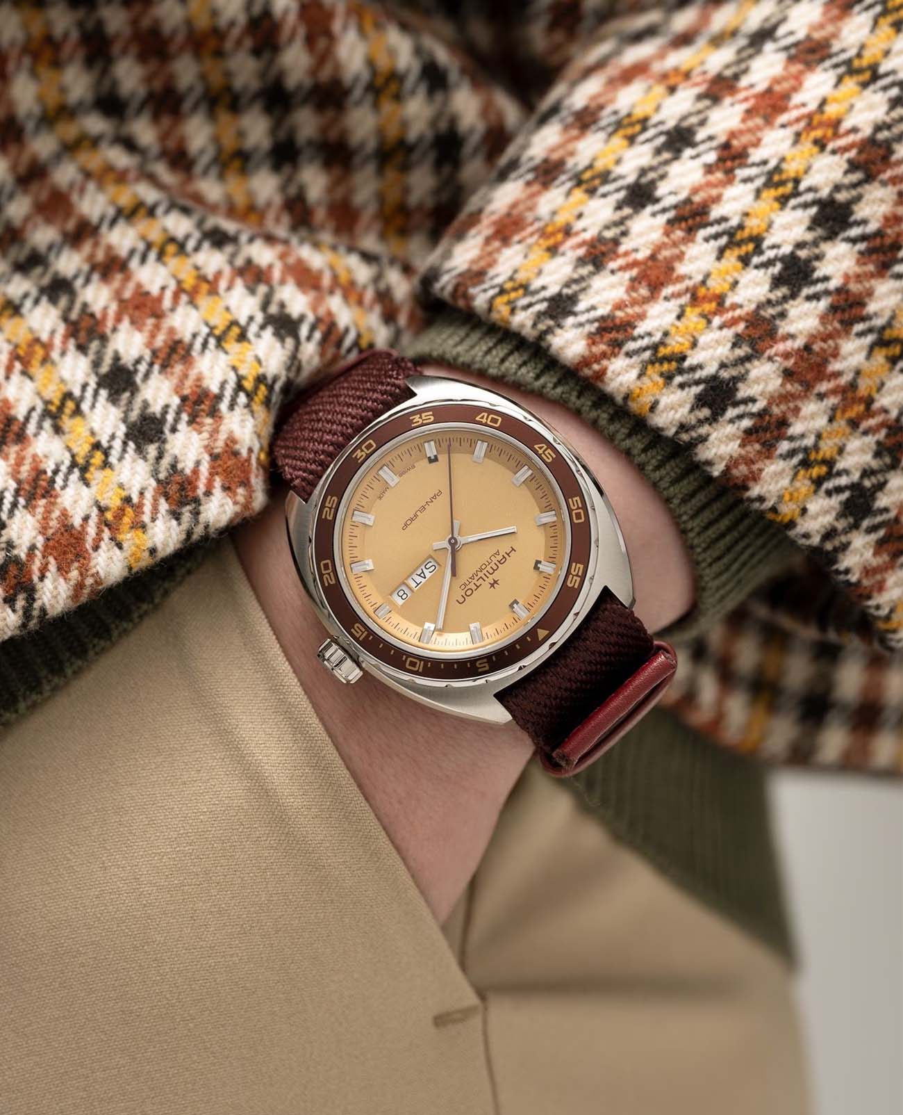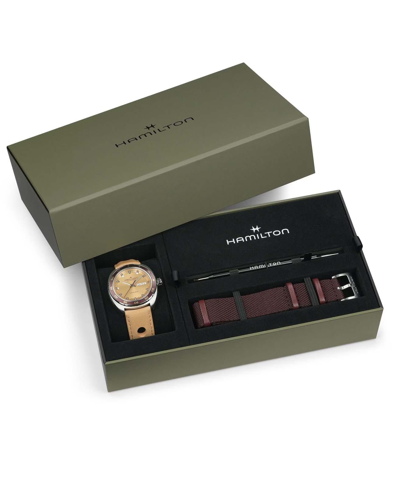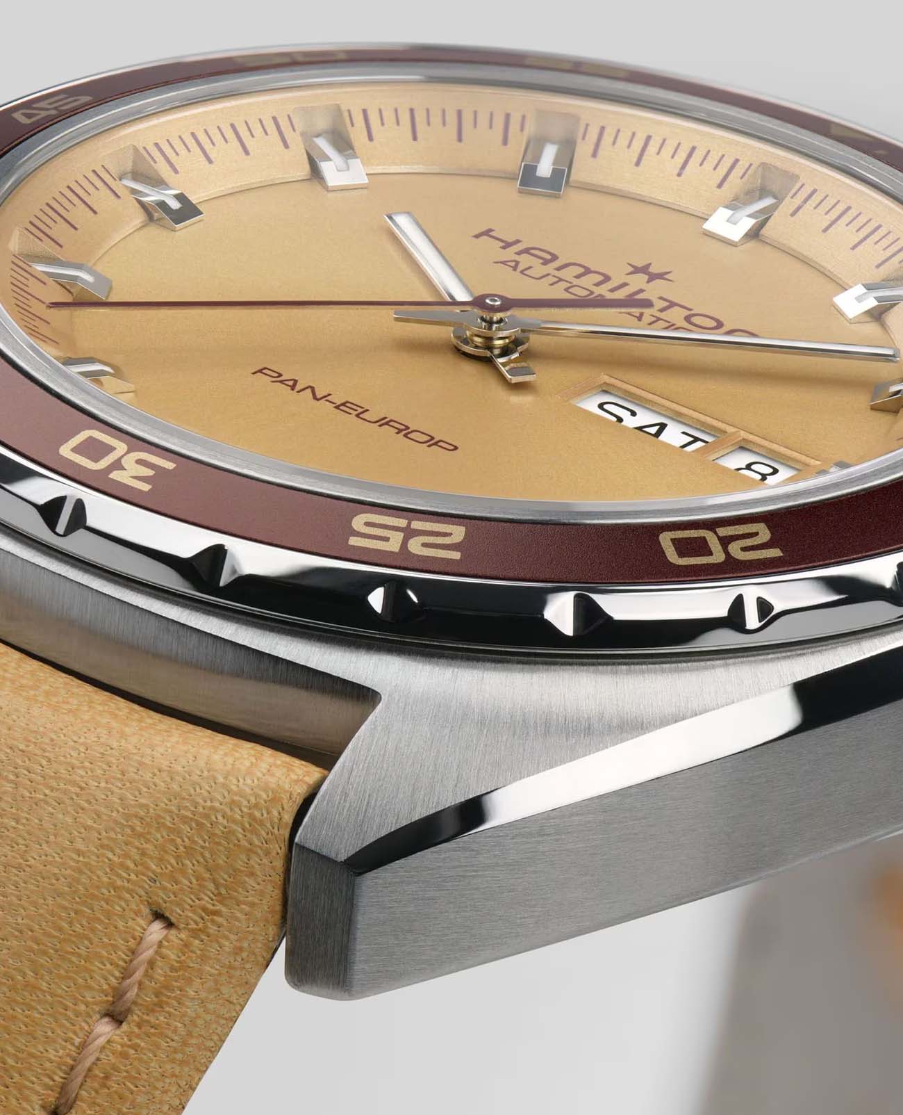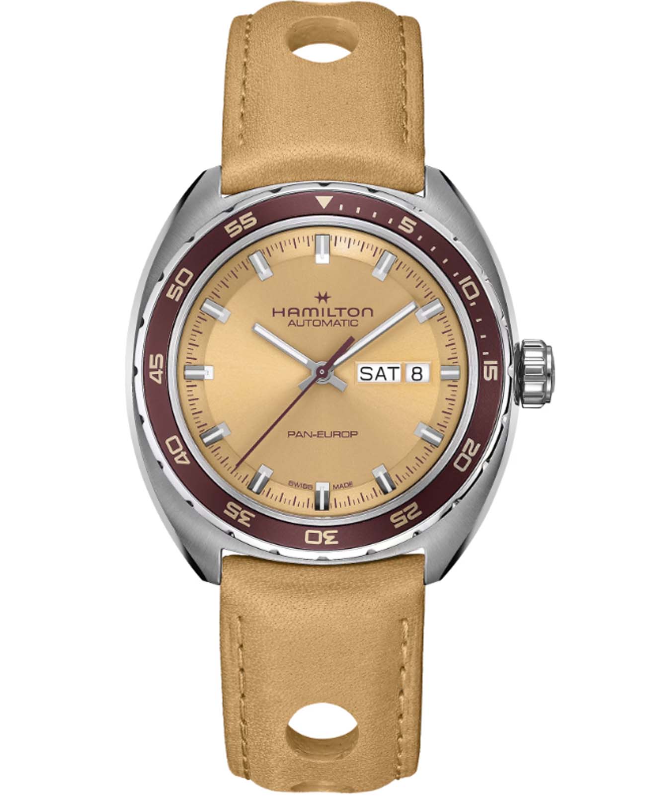 Мужские часы Hamilton American Classic Pan Europ Day Date Auto H35435820. Механизм с автоматическим подзаводом Сапфировое стеклоСапфировое стеклоПрочный и надёжный материал из кристалла сапфира синтетического происхождения, характеризующийся особой твёрдостью и устойчивостью к царапинам и повреждениям. устойчивое к появлению царапин, обладающее высокой прозрачностью. Класс водозащиты: 50 метров, позволит защитить корпус от случайных брызг или капель дождя. Корпус часов изготовлен из нержавеющей стали. Кожаный ремешок с раскладной застёжкойРаскладная застёжкаТакой тип застёжки используется только на браслетах из металла. Она никогда не раскрывается полностью, происходит разделение на 2 и более частей. Раскладывающая застёжка снизит вероятность потери часов к минимуму.. БезельБезельВнешний ободок, закрепляющий стекло. В спортивных часах так называется поворотное кольцо с делениями на циферблате, выполняет роль таймера – замеряет отрезки времени на шкале. Неподвижный безель – элемент декора. Однонаправленно вращающийся безель на дайверских часах позволяет фиксировать моменты погружения и выныривания на поверхность. с PVD-покрытиемPVDУльтратонкое покрытие наносится в технике вакуумного напыления, сочетает в себе нитрид титана особой прочности со слоем золота или оксида хрома. Несёт в себе декоративную или защитную функцию.. В комплект входит сменный тканевый ремешок. Стрелки и метки с люминесцентным покрытиемЛюминесцентное покрытиеПозволяет считывать показания времени в темноте. Производители наносят на стрелки, часовые индексы, безель или поверхность циферблата светонакопительный состав, дающий холодное свечение..