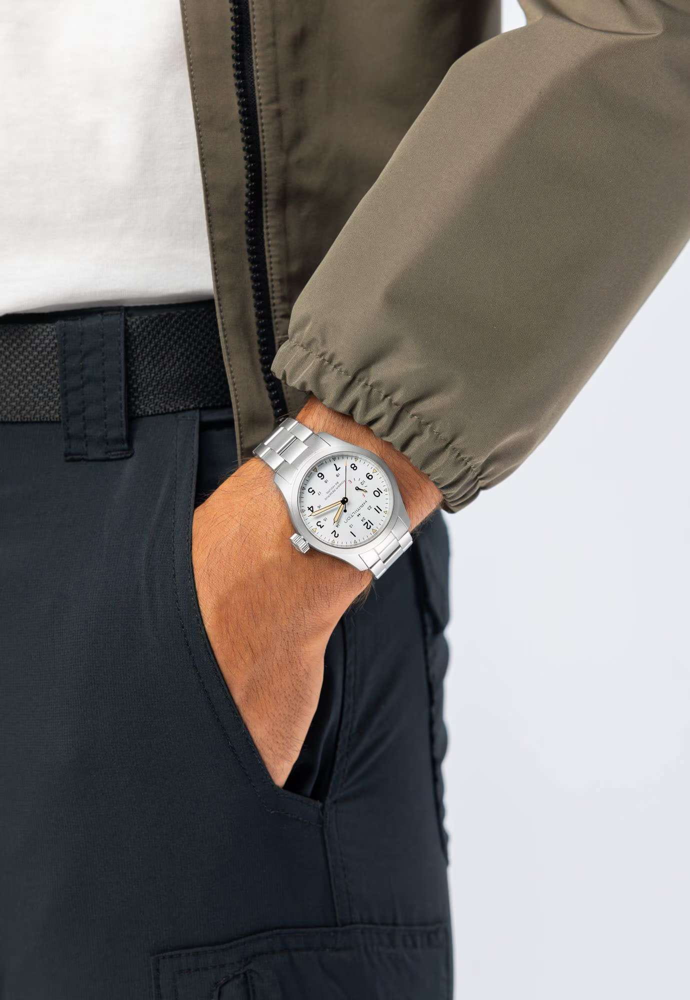 Мужские наручные часы Hamilton Khaki Field Mechanical Power Reserve 40mm H69509110 сочетают в себе спортивный стиль и элегантный дизайн. Модель обладает круглым корпусом диаметром 40 мм, изготовленным из нержавеющей стали, что обеспечивает высокую устойчивость к внешним воздействиям. Изысканный браслет выполнен из нержавеющей стали  с раскладной застёжкойРаскладная застёжкаТакой тип застёжки используется только на браслетах из металла. Она никогда не раскрывается полностью, происходит разделение на 2 и более частей. Раскладывающая застёжка снизит вероятность потери часов к минимуму., гарантирующей комфортное ношение и безопасность. Лаконичный циферблат оснащен крупными цифрами и стрелками с люминесцентным покрытиемЛюминесцентное покрытиеПозволяет считывать показания времени в темноте. Производители наносят на стрелки, часовые индексы, безель или поверхность циферблата светонакопительный состав, дающий холодное свечение. Super-LumiNova®, обеспечивающим превосходную видимость в темноте. Для защиты используется сапфировое стеклоСапфировое стеклоПрочный и надёжный материал из кристалла сапфира синтетического происхождения, характеризующийся особой твёрдостью и устойчивостью к царапинам и повреждениям., которое эффективно противостоит царапинам и имеет антибликовое покрытиеАнтибликовое покрытиеСлой оксида металла в 0,13-0,3 микрон, благодаря которому стекло часов не бликует и не отражает свет. Антибликовое покрытие уменьшает отражение света в 10 раз, обеспечивая отличную читаемость показателей циферблата.. Часы работают с помощью механизма H-23. На циферблате также буквы «F» для обозначения полного заряда и «E» для обозначения пустого заряда, что подчеркивает эту исключительную и практичную функцию. Водонепроницаемость часов достигает 10 атмосфер (100 метров), делающая их подходящими для повседневного использования и активного отдыха. Это сочетание высокой прочности, точности и изысканного дизайна для уверенных в себе мужчин.