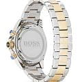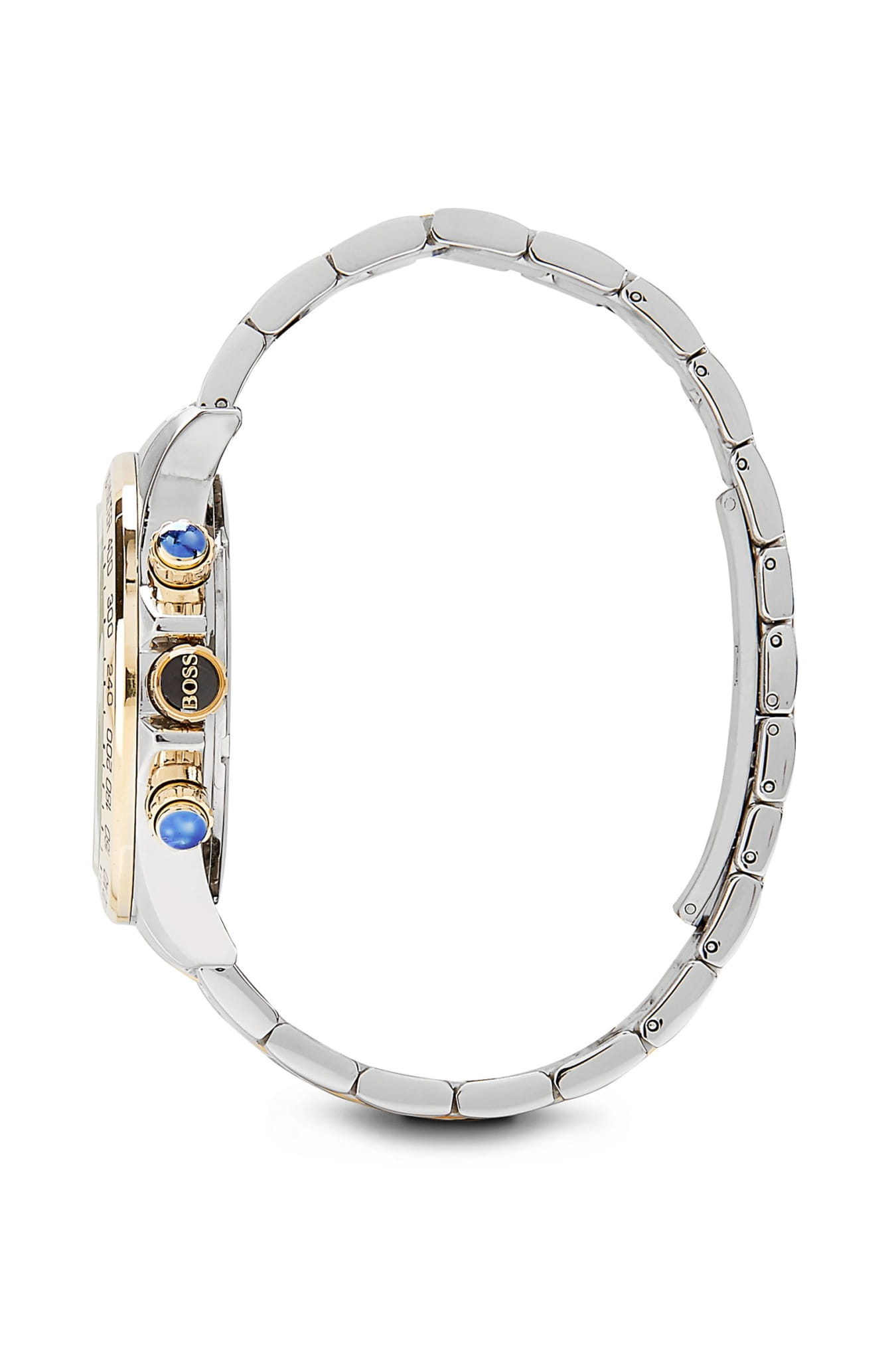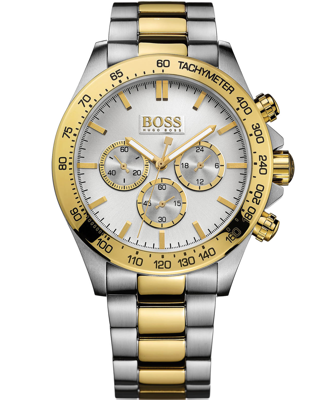 Мужские кварцевые часы Hugo Boss Ikon HB1512960 представлены в двухцветном корпусе из нержавеющей стали с IP-покрытиемIP-покрытиеМетод ионного напыления. Демонстрирует повышенную устойчивость к истиранию, окислению и химическим веществам. Под воздействием высокого давления и температуры около 1500°C молекулы металла надёжно соединяются с частицами корпуса часов. диаметром 46 мм, сочетая стильный дизайн с функциональностью хронографа. Модель оснащена кварцевым механизмом с тремя субдиалами (60-секундный, 30-минутный и 24-часовой счетчики), дополненными тахиметрической шкалойТахиметрРазмеченная шкала, располагается на ободке или безеле часов. Тахиметр позволяет рассчитать скорость на определённом участке пути, расстояние измеряется в километрах или милях. на золотистом безелеБезельВнешний ободок, закрепляющий стекло. В спортивных часах так называется поворотное кольцо с делениями на циферблате, выполняет роль таймера – замеряет отрезки времени на шкале. Неподвижный безель – элемент декора. Однонаправленно вращающийся безель на дайверских часах позволяет фиксировать моменты погружения и выныривания на поверхность.. Серебристый циферблат с позолоченными метками и стрелками защищен прочным минеральным стекломМинеральное стеклоМинеральное стекло представляет собой искусственно выращенный минерал кварца. Такое стекло отличается особой устойчивостью к повреждениям и царапинам. Уступает по некоторым качествам сапфировому стеклу., обеспечивающим отличную читаемость. Двухцветный браслет из нержавеющей стали шириной 20-22 мм обеспечивает комфортную посадку на запястье. Ударопрочный корпусУдаропрочный корпусМеханизм заключён в корпус, выполненный из современных материалов, устойчивых к ударам, механическим повреждениям и падению с высоты: инновационный пластик, карбон, нержавеющая сталь, титан. с делает часы устойчивыми к повседневным нагрузкам.