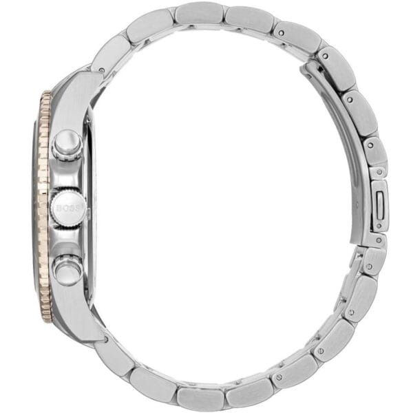 Мужские часы Hugo Boss Ocean HB1513705 представлены в изысканном 48-мм корпусе из нержавеющей стали с поворотным безелемБезельВнешний ободок, закрепляющий стекло. В спортивных часах так называется поворотное кольцо с делениями на циферблате, выполняет роль таймера – замеряет отрезки времени на шкале. Неподвижный безель – элемент декора. Однонаправленно вращающийся безель на дайверских часах позволяет фиксировать моменты погружения и выныривания на поверхность. с IP-покрытиемIP-покрытиеМетод ионного напыления. Демонстрирует повышенную устойчивость к истиранию, окислению и химическим веществам. Под воздействием высокого давления и температуры около 1500°C молекулы металла надёжно соединяются с частицами корпуса часов.. Элегантная модель оснащена кварцевым механизмом с функциями хронографаХронографФункция позволяет измерять отрезки времени с особой точностью: часы, минуты, секунды. Верным признаком хронографа является наличие на циферблате 3 дополнительных окошек-счётчиков. и секундомераСекундомерСекундоме́р — прибор, способный измерять интервалы времени с точностью до долей секунды.. Черный циферблат защищен устойчивым к царапинам минеральным стекломМинеральное стеклоМинеральное стекло представляет собой искусственно выращенный минерал кварца. Такое стекло отличается особой устойчивостью к повреждениям и царапинам. Уступает по некоторым качествам сапфировому стеклу.. Браслет из стали с IP-покрытиемIP-покрытиеМетод ионного напыления. Демонстрирует повышенную устойчивость к истиранию, окислению и химическим веществам. Под воздействием высокого давления и температуры около 1500°C молекулы металла надёжно соединяются с частицами корпуса часов. дополнен раскладной застёжкойРаскладная застёжкаТакой тип застёжки используется только на браслетах из металла. Она никогда не раскрывается полностью, происходит разделение на 2 и более частей. Раскладывающая застёжка снизит вероятность потери часов к минимуму., а стрелки и метки покрыты люминесцентным составомЛюминесцентное покрытиеПозволяет считывать показания времени в темноте. Производители наносят на стрелки, часовые индексы, безель или поверхность циферблата светонакопительный состав, дающий холодное свечение. для видимости в темноте. Водонепроницаемость 100 метров (10 ATM) позволяет использовать часы для плавания других водных видов спорта. Точность хода составляет ±15 секунд в месяц, что соответствует стандартам кварцевых механизмов. Дизайн модели сочетает спортивную функциональность с элегантным стилем.