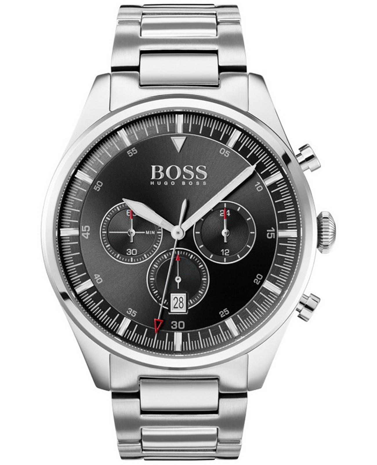 Мужские часы Hugo Boss Pionner HB1513712 представлены в круглом 44-мм корпусе из нержавеющей стали 316L с кварцевым механизмом. Модель оснащена функциями хронографаХронографФункция позволяет измерять отрезки времени с особой точностью: часы, минуты, секунды. Верным признаком хронографа является наличие на циферблате 3 дополнительных окошек-счётчиков., секундомераСекундомерСекундоме́р — прибор, способный измерять интервалы времени с точностью до долей секунды. и индикацией даты. Черный циферблат защищен минеральным стекломМинеральное стеклоМинеральное стекло представляет собой искусственно выращенный минерал кварца. Такое стекло отличается особой устойчивостью к повреждениям и царапинам. Уступает по некоторым качествам сапфировому стеклу., а водонепроницаемость 50 метров (WR30) защищает от брызг. Браслет из нержавеющей стали 316L с раскладной застёжкойРаскладная застёжкаТакой тип застёжки используется только на браслетах из металла. Она никогда не раскрывается полностью, происходит разделение на 2 и более частей. Раскладывающая застёжка снизит вероятность потери часов к минимуму. обеспечивает удобную посадку.