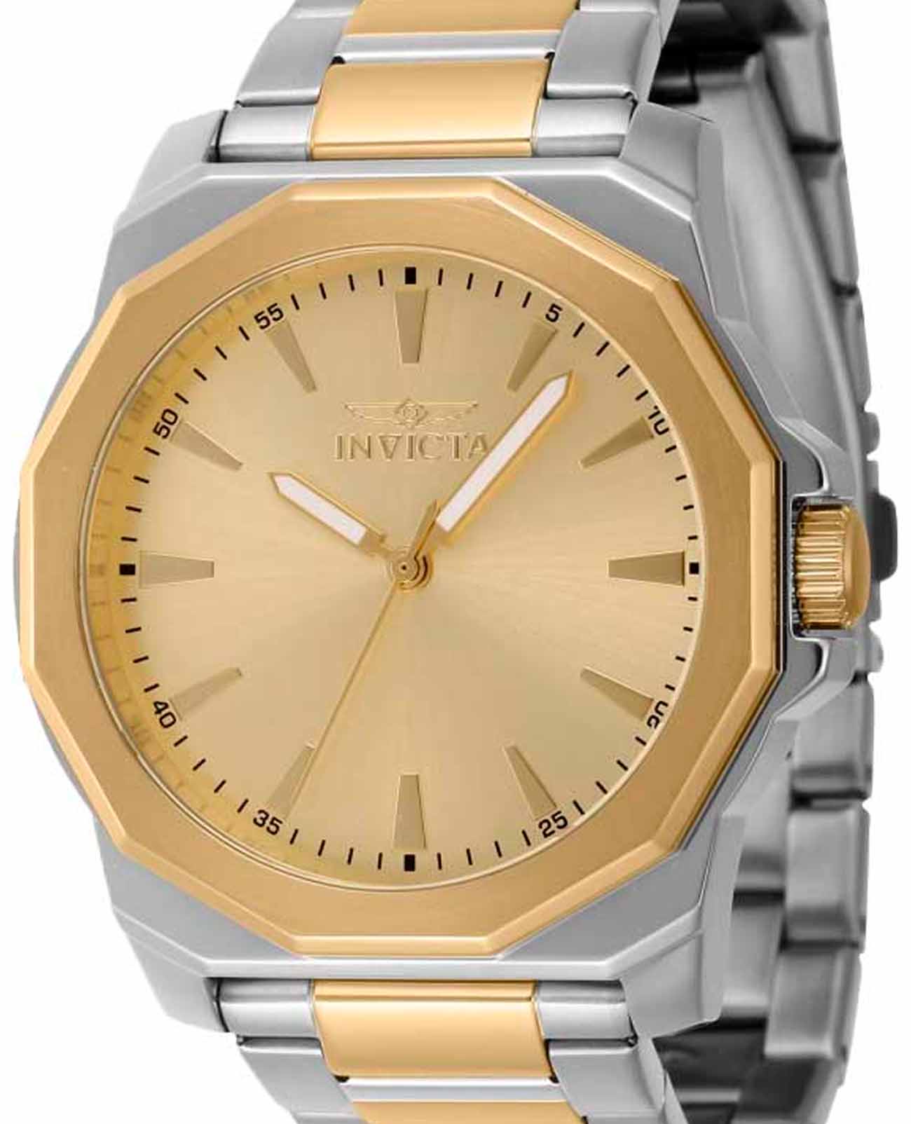 Мужские наручные часы Invicta IN46835, сочетающей в себе стильный дизайн и надежность современных технологий, обладают круглым корпусом, изготовленным из качественной стали, что обеспечивает устойчивость к внешним воздействиям. БезельБезельВнешний ободок, закрепляющий стекло. В спортивных часах так называется поворотное кольцо с делениями на циферблате, выполняет роль таймера – замеряет отрезки времени на шкале. Неподвижный безель – элемент декора. Однонаправленно вращающийся безель на дайверских часах позволяет фиксировать моменты погружения и выныривания на поверхность. с IP-покрытиемIP-покрытиеМетод ионного напыления. Демонстрирует повышенную устойчивость к истиранию, окислению и химическим веществам. Под воздействием высокого давления и температуры около 1500°C молекулы металла надёжно соединяются с частицами корпуса часов.. Модель оснащена золотистым циферблатом, который гармонично дополняет минеральное стеклоМинеральное стеклоМинеральное стекло представляет собой искусственно выращенный минерал кварца. Такое стекло отличается особой устойчивостью к повреждениям и царапинам. Уступает по некоторым качествам сапфировому стеклу., прошедшее специальную закалку для придания большей прочности . Браслет выполнен так же из стали с частичным IP-покрытиемIP-покрытиеМетод ионного напыления. Демонстрирует повышенную устойчивость к истиранию, окислению и химическим веществам. Под воздействием высокого давления и температуры около 1500°C молекулы металла надёжно соединяются с частицами корпуса часов.