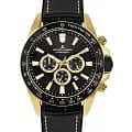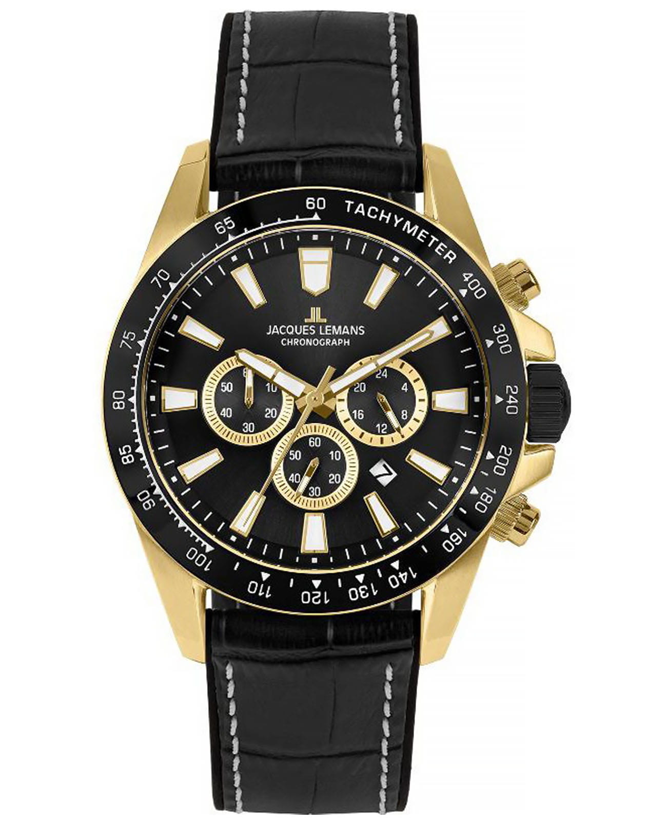 Кварцевый хронографХронографФункция позволяет измерять отрезки времени с особой точностью: часы, минуты, секунды. Верным признаком хронографа является наличие на циферблате 3 дополнительных окошек-счётчиков. в мощном корпусе диаметром 48 мм. Нержавеющая сталь с IP-покрытиемIP-покрытиеМетод ионного напыления. Демонстрирует повышенную устойчивость к истиранию, окислению и химическим веществам. Под воздействием высокого давления и температуры около 1500°C молекулы металла надёжно соединяются с частицами корпуса часов., из которой он сделан, отличается гипоаллергенными свойствами и стойкостью к коррозии. Широкий контрастный безельБезельВнешний ободок, закрепляющий стекло. В спортивных часах так называется поворотное кольцо с делениями на циферблате, выполняет роль таймера – замеряет отрезки времени на шкале. Неподвижный безель – элемент декора. Однонаправленно вращающийся безель на дайверских часах позволяет фиксировать моменты погружения и выныривания на поверхность. с тахиметрической шкалой обрамляет зеленый циферблат. На нем расположены три дополнительных индикатора и окошко даты. С помощью индикаторов можно засекать временные промежутки (секунды и минуты) и определять время в 24-часовом формате времяисчисления. В модели установлено минеральное стеклоМинеральное стеклоМинеральное стекло представляет собой искусственно выращенный минерал кварца. Такое стекло отличается особой устойчивостью к повреждениям и царапинам. Уступает по некоторым качествам сапфировому стеклу.. Повышенная водостойкость равна 10 атмосфер. Ремешок выполнен из натуральной кожи черного цвета с прошивкой, застежка украшена логотипом бренда. Часы Jacques Lemans, надежные и функциональные, хорошо дополнят образ в спортивном или повседневном стиле.