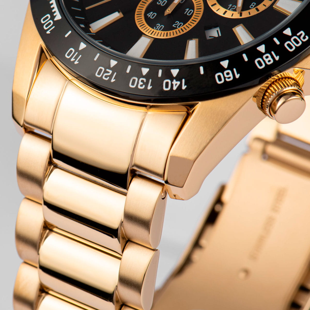 Кварцевый хронографХронографФункция позволяет измерять отрезки времени с особой точностью: часы, минуты, секунды. Верным признаком хронографа является наличие на циферблате 3 дополнительных окошек-счётчиков. в мощном корпусе диаметром 48 мм. Нержавеющая сталь с PVD-покрытиемPVDУльтратонкое покрытие наносится в технике вакуумного напыления, сочетает в себе нитрид титана особой прочности со слоем золота или оксида хрома. Несёт в себе декоративную или защитную функцию., из которой он сделан, отличается гипоаллергенными свойствами и стойкостью к коррозии. Широкий контрастный безельБезельВнешний ободок, закрепляющий стекло. В спортивных часах так называется поворотное кольцо с делениями на циферблате, выполняет роль таймера – замеряет отрезки времени на шкале. Неподвижный безель – элемент декора. Однонаправленно вращающийся безель на дайверских часах позволяет фиксировать моменты погружения и выныривания на поверхность. с тахиметрической шкалой обрамляет зеленый циферблат. На нем расположены три дополнительных индикатора и окошко даты. С помощью индикаторов можно засекать временные промежутки (секунды и минуты) и определять время в 24-часовом формате времяисчисления. В модели установлено минеральное стеклоМинеральное стеклоМинеральное стекло представляет собой искусственно выращенный минерал кварца. Такое стекло отличается особой устойчивостью к повреждениям и царапинам. Уступает по некоторым качествам сапфировому стеклу.. Повышенная водостойкость равна 10 атмосфер. Браслет из нержавеющей стали с PVD-покрытиемPVDУльтратонкое покрытие наносится в технике вакуумного напыления, сочетает в себе нитрид титана особой прочности со слоем золота или оксида хрома. Несёт в себе декоративную или защитную функцию. удерживает на запястье раскладная застёжкаРаскладная застёжкаТакой тип застёжки используется только на браслетах из металла. Она никогда не раскрывается полностью, происходит разделение на 2 и более частей. Раскладывающая застёжка снизит вероятность потери часов к минимуму.. Часы Jacques Lemans, надежные и функциональные, хорошо дополнят образ в спортивном или повседневном стиле.