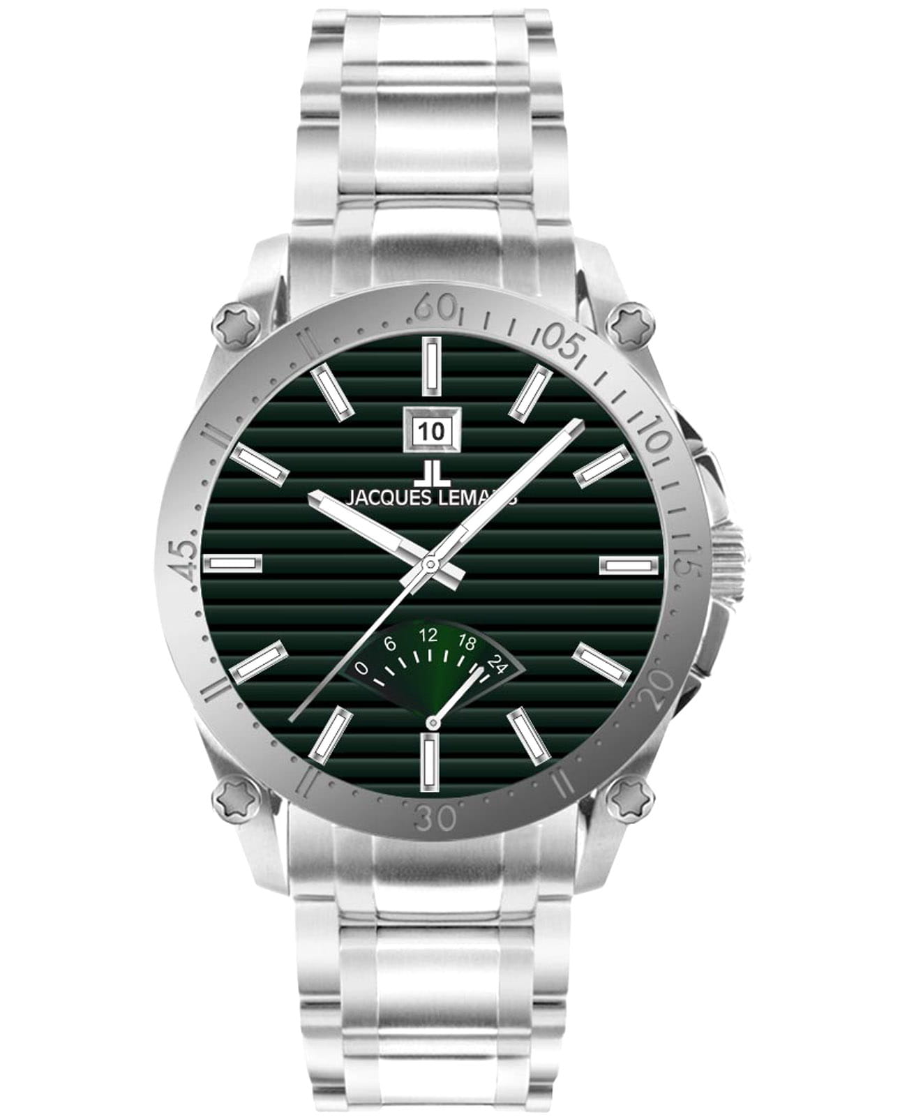 Мужские кварцевые часы Jacques Lemans 1-2202M – лаконичная красота и изысканная элегантность. Оригинальная модель с классическим оформлением станет превосходным завершением образа, наделив его индивидуальным характером. Корпус выполнен из нержавеющей стали, диаметром 44 мм, что обеспечивает долговечность и утончённый внешний вид. Минеральное стеклоМинеральное стеклоМинеральное стекло представляет собой искусственно выращенный минерал кварца. Такое стекло отличается особой устойчивостью к повреждениям и царапинам. Уступает по некоторым качествам сапфировому стеклу. с сапфировым напылением защищает циферблат от царапин. Стальной браслет на раскладной застёжкеРаскладная застёжкаТакой тип застёжки используется только на браслетах из металла. Она никогда не раскрывается полностью, происходит разделение на 2 и более частей. Раскладывающая застёжка снизит вероятность потери часов к минимуму. обеспечивает комфортное ношение. На неподвижный безельБезельВнешний ободок, закрепляющий стекло. В спортивных часах так называется поворотное кольцо с делениями на циферблате, выполняет роль таймера – замеряет отрезки времени на шкале. Неподвижный безель – элемент декора. Однонаправленно вращающийся безель на дайверских часах позволяет фиксировать моменты погружения и выныривания на поверхность. нанесена минутная шкала. Водозащита 100 метров позволит плавать, нырять и заниматься другими водными видами спорта. Стрелки и метки с люминесцентным покрытиемЛюминесцентное покрытиеПозволяет считывать показания времени в темноте. Производители наносят на стрелки, часовые индексы, безель или поверхность циферблата светонакопительный состав, дающий холодное свечение. позволяющие легко определять время даже в темноте. Окошко даты находится в положении 12 часов. Индикатор 24-х часов вынесен на отдельный циферблат. Рифленая заводная головка с защитой. Это аксессуар для мужчины, который ценит классический стиль и функциональность.