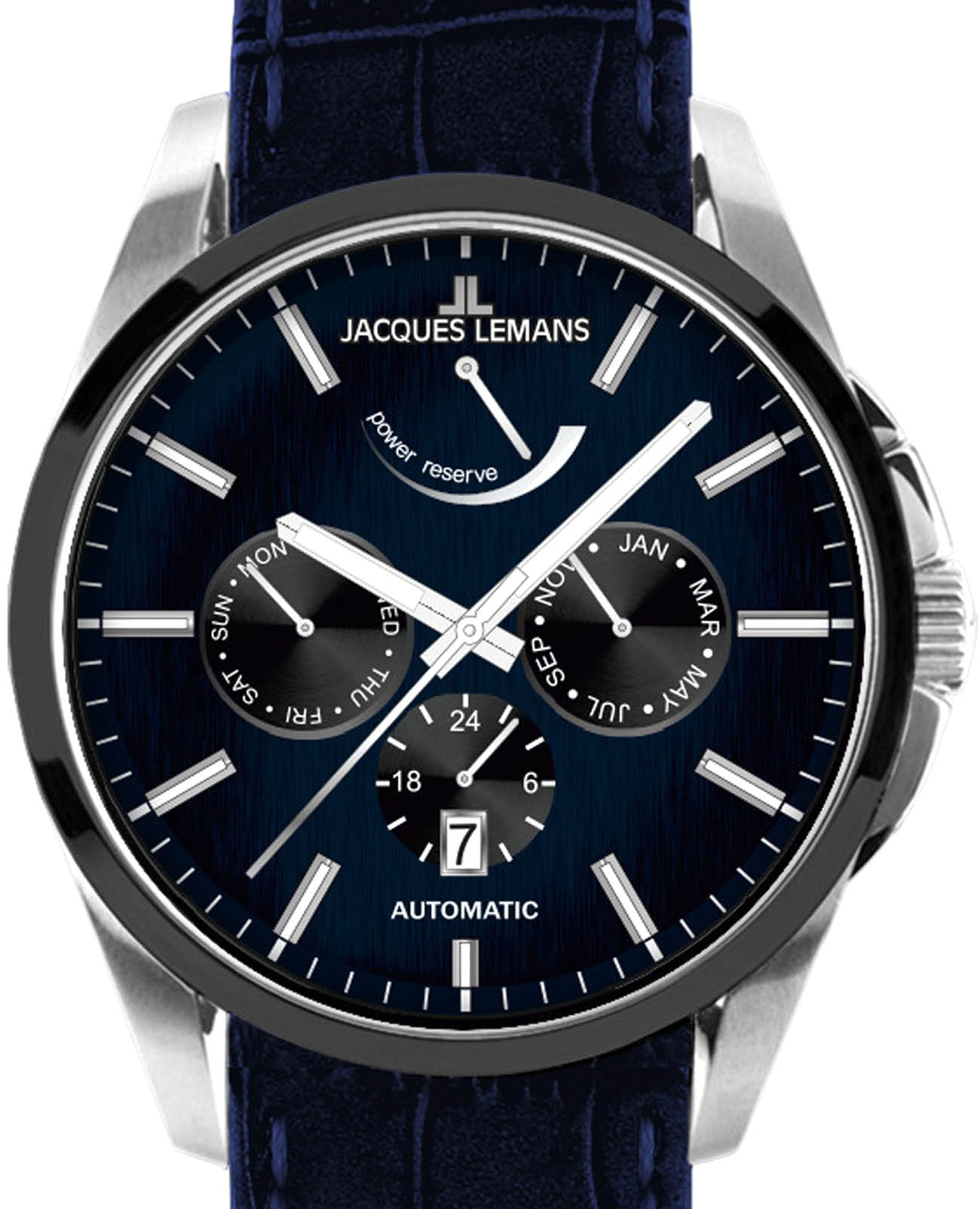 Мужские механические часы с автоподзаводом Jacques Lemans 1-2204P – лаконичная красота и изысканная элегантность. Оригинальная модель с классическим оформлением станет превосходным завершением образа, наделив его индивидуальным характером. Корпус выполнен из нержавеющей стали серебристого цвета, диаметром 44 мм, что обеспечивает долговечность и утончённый внешний вид. Минеральное стеклоМинеральное стеклоМинеральное стекло представляет собой искусственно выращенный минерал кварца. Такое стекло отличается особой устойчивостью к повреждениям и царапинам. Уступает по некоторым качествам сапфировому стеклу. с сапфировым напылением защищает циферблат от царапин. Неподвижный безельБезельВнешний ободок, закрепляющий стекло. В спортивных часах так называется поворотное кольцо с делениями на циферблате, выполняет роль таймера – замеряет отрезки времени на шкале. Неподвижный безель – элемент декора. Однонаправленно вращающийся безель на дайверских часах позволяет фиксировать моменты погружения и выныривания на поверхность. с PVD-покрытиемPVDУльтратонкое покрытие наносится в технике вакуумного напыления, сочетает в себе нитрид титана особой прочности со слоем золота или оксида хрома. Несёт в себе декоративную или защитную функцию. черного цвета. Кожаный ремешок на стандартной застёжке обеспечивает комфортное ношение. Водозащита 100 метров позволит плавать, нырять и заниматься другими водными видами спорта. Стрелки и метки с люминесцентным покрытиемЛюминесцентное покрытиеПозволяет считывать показания времени в темноте. Производители наносят на стрелки, часовые индексы, безель или поверхность циферблата светонакопительный состав, дающий холодное свечение. позволяющие легко определять время даже в темноте. 12-ти и 24-х часовой формат времени. День недели и месяц вынесены на отдельные циферблаты. Окошко даты находится в положении 6 часов. Рифленая заводная головка с защитой. Это аксессуар для мужчины, который ценит классический стиль и функциональность.