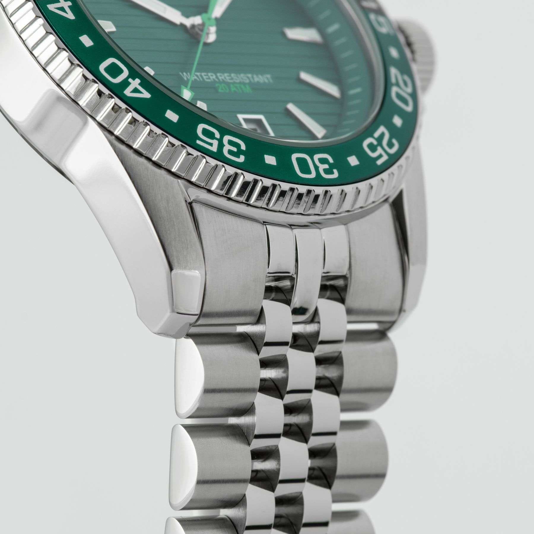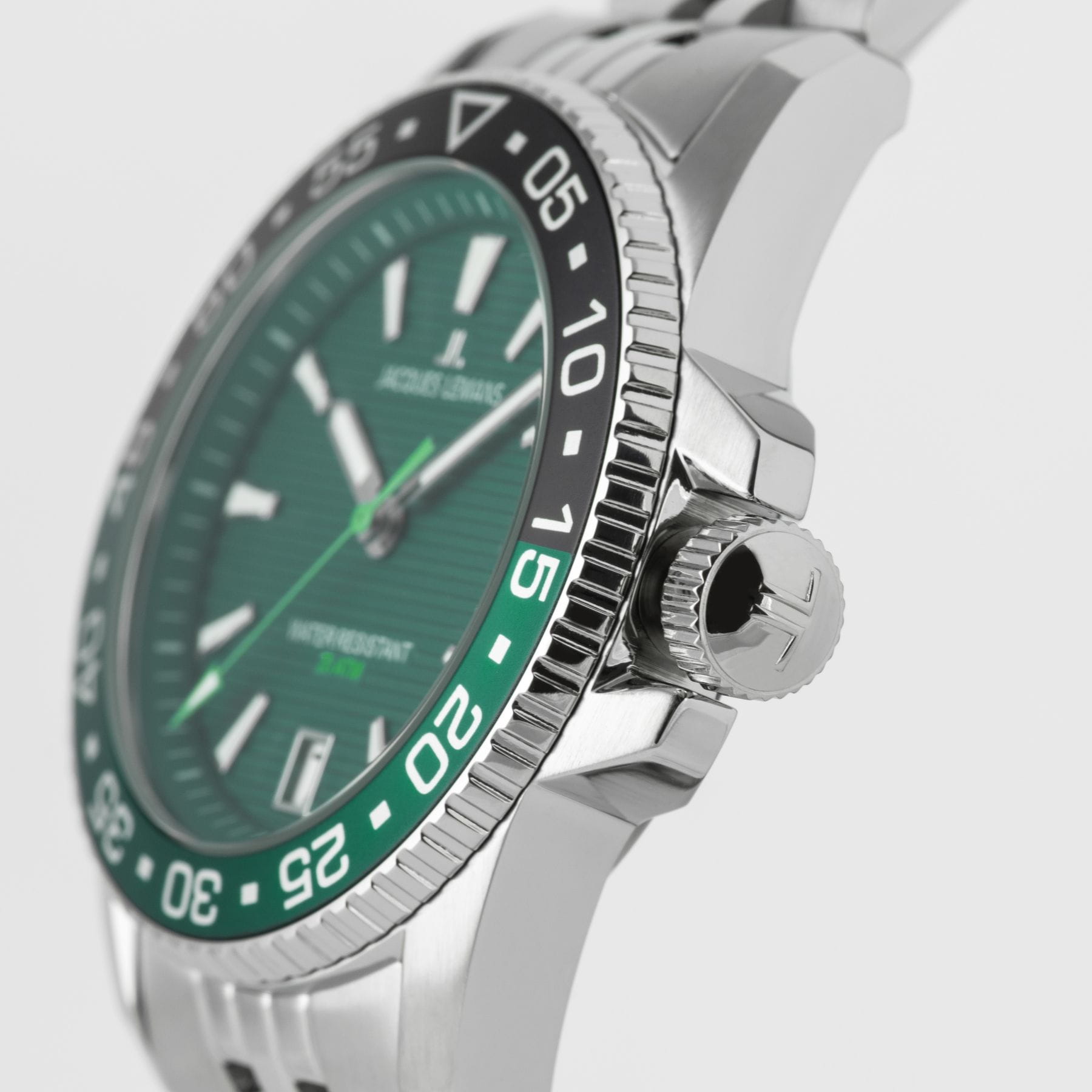 Мужские спортивные часы Jacques Lemans Liverpool Diver 1-2205J представляют собой стильный аксессуар, отражающий идеальное сочетание современного дизайна, надёжности и функциональности. Корпус из нержавеющей стали диаметром 41 мм идеально сбалансирован и элегантен. Ударопрочное минеральное стеклоМинеральное стеклоМинеральное стекло представляет собой искусственно выращенный минерал кварца. Такое стекло отличается особой устойчивостью к повреждениям и царапинам. Уступает по некоторым качествам сапфировому стеклу. Crystex защищает циферблат от царапин. Широкий безельБезельВнешний ободок, закрепляющий стекло. В спортивных часах так называется поворотное кольцо с делениями на циферблате, выполняет роль таймера – замеряет отрезки времени на шкале. Неподвижный безель – элемент декора. Однонаправленно вращающийся безель на дайверских часах позволяет фиксировать моменты погружения и выныривания на поверхность. с PVD-покрытиемPVDУльтратонкое покрытие наносится в технике вакуумного напыления, сочетает в себе нитрид титана особой прочности со слоем золота или оксида хрома. Несёт в себе декоративную или защитную функцию., на который вынесена дополнительная индикация секунд. Стальной браслет на раскладной застёжке с фиксаторомРаскладная застёжкаТакой тип застёжки используется только на браслетах из металла. Она никогда не раскрывается полностью, происходит разделение на 2 и более частей. Раскладывающая застёжка снизит вероятность потери часов к минимуму. обеспечивает комфортное ношение. Водозащита 200 метров позволит плавать, нырять и заниматься другими водными видами спорта. Стрелки и метки с люминесцентным покрытиемЛюминесцентное покрытиеПозволяет считывать показания времени в темноте. Производители наносят на стрелки, часовые индексы, безель или поверхность циферблата светонакопительный состав, дающий холодное свечение. позволяющие легко определять время даже в темноте. Окошко даты находится в положении между 6 часов. Это аксессуар для мужчины, который ценит классический стиль и функциональность.