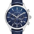 Водозащита 5 ATM защищает часы от брызг и дождя. Кожаный ремешок синего цвета с классической застёжкой обеспечивает комфортное ношение и надёжную фиксацию на запястье.
