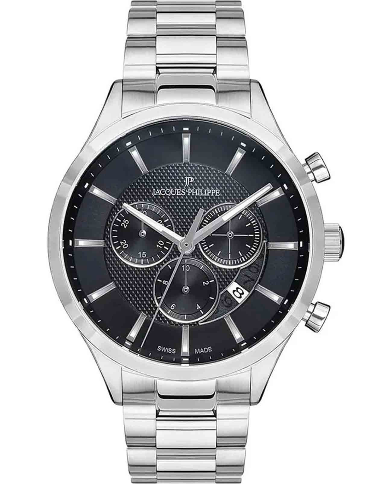 Швейцарские мужские часы-хронографХронографФункция позволяет измерять отрезки времени с особой точностью: часы, минуты, секунды. Верным признаком хронографа является наличие на циферблате 3 дополнительных окошек-счётчиков. Jacques Philippe Gallant JPQGC031316N, кварцевый механизм с высокой точностью. Сапфировое стеклоСапфировое стеклоПрочный и надёжный материал из кристалла сапфира синтетического происхождения, характеризующийся особой твёрдостью и устойчивостью к царапинам и повреждениям. устойчивое к появлению царапин, обладающее высокой прозрачностью. Корпус часов изготовлен из нержавеющей стали. На циферблате три дополнительных индикатора. Стрелки с люминесцентным покрытиемЛюминесцентное покрытиеПозволяет считывать показания времени в темноте. Производители наносят на стрелки, часовые индексы, безель или поверхность циферблата светонакопительный состав, дающий холодное свечение.. Окошко даты находится между 4 и 5 часами. Класс водозащиты: 50 метров, позволит защитить корпус от случайных брызг или капель дождя. Стальной браслет на застёжке «бабочка» с кнопкамиЗастёжка "бабочка"Такой вид застёжки дополняется предохранителями, помогающими избежать случайного раскрытия браслета. Обладают изящным исполнением. .