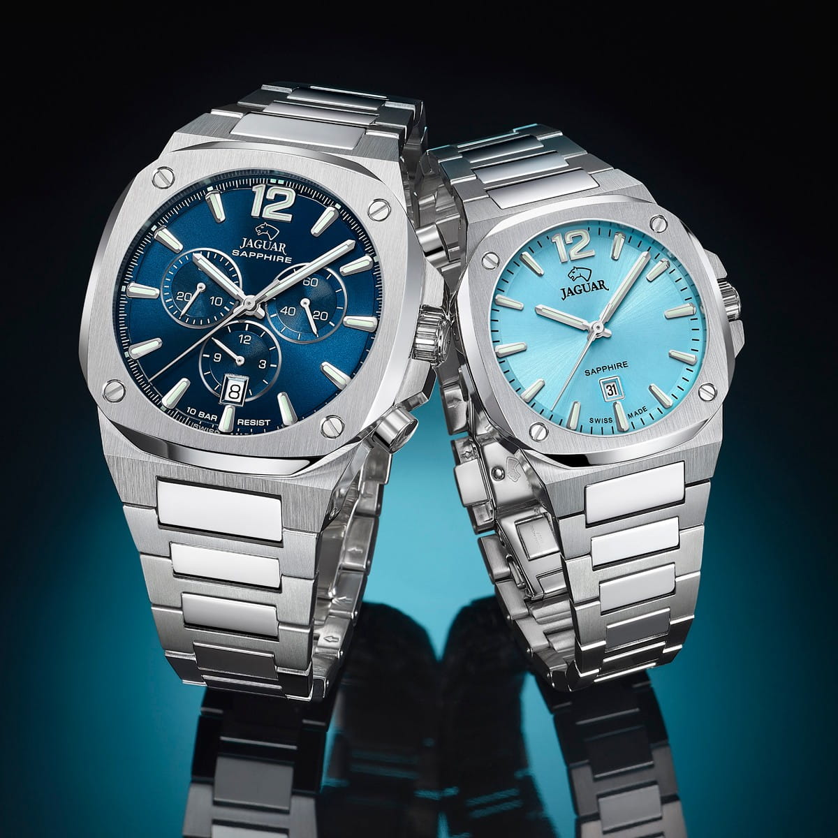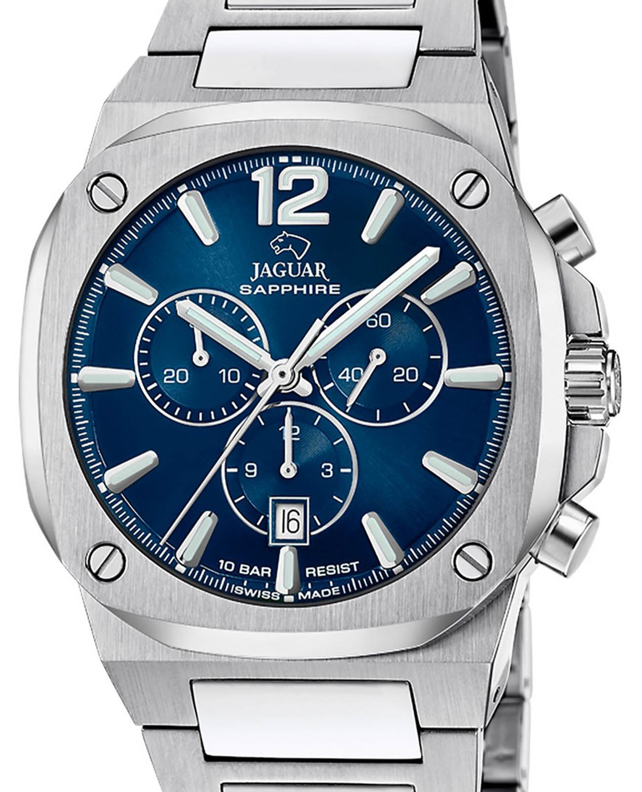 Мужские швейцарские часы-хронографХронографФункция позволяет измерять отрезки времени с особой точностью: часы, минуты, секунды. Верным признаком хронографа является наличие на циферблате 3 дополнительных окошек-счётчиков. Jaguar Rond Carre J1025/1. Кварцевый швейцарский калибр Ronda 5030d. Сапфировое стеклоСапфировое стеклоПрочный и надёжный материал из кристалла сапфира синтетического происхождения, характеризующийся особой твёрдостью и устойчивостью к царапинам и повреждениям. устойчивое к мелким механическим повреждениям. Корпус и браслет часов изготовлены из нержавеющей стали. Стрелки и метки с люминесцентным покрытиемЛюминесцентное покрытиеПозволяет считывать показания времени в темноте. Производители наносят на стрелки, часовые индексы, безель или поверхность циферблата светонакопительный состав, дающий холодное свечение.. Окошко даты находится в положении 6 часов. Класс водозащиты: 100 метров, позволит плавать, нырять и заниматься другими водными видами спорта. Стальной браслет на раскладной застёжкеРаскладная застёжкаТакой тип застёжки используется только на браслетах из металла. Она никогда не раскрывается полностью, происходит разделение на 2 и более частей. Раскладывающая застёжка снизит вероятность потери часов к минимуму..