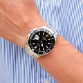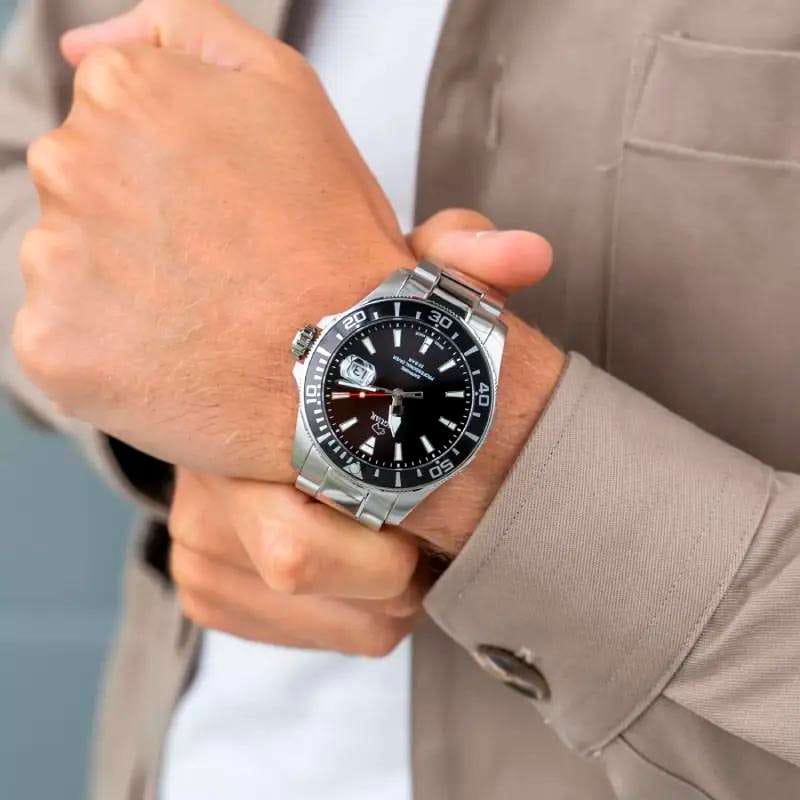 Мужские швейцарские часы Jaguar Executive Diver J860/D. Кварцевый швейцарский калибр Ronda 6003D. Сапфировое стеклоСапфировое стеклоПрочный и надёжный материал из кристалла сапфира синтетического происхождения, характеризующийся особой твёрдостью и устойчивостью к царапинам и повреждениям. устойчивое к мелким механическим повреждениям. Корпус и браслет часов изготовлены из нержавеющей стали. Стрелки и метки с люминесцентным покрытиемЛюминесцентное покрытиеПозволяет считывать показания времени в темноте. Производители наносят на стрелки, часовые индексы, безель или поверхность циферблата светонакопительный состав, дающий холодное свечение.. Окошко даты находится в положении 3 часа. Класс водозащиты: 200 метров, позволит плавать, нырять и заниматься другими водными видами спорта. Стальной браслет на раскладной застёжкеРаскладная застёжкаТакой тип застёжки используется только на браслетах из металла. Она никогда не раскрывается полностью, происходит разделение на 2 и более частей. Раскладывающая застёжка снизит вероятность потери часов к минимуму.. БезельБезельВнешний ободок, закрепляющий стекло. В спортивных часах так называется поворотное кольцо с делениями на циферблате, выполняет роль таймера – замеряет отрезки времени на шкале. Неподвижный безель – элемент декора. Однонаправленно вращающийся безель на дайверских часах позволяет фиксировать моменты погружения и выныривания на поверхность. с PVD-покрытиемPVDУльтратонкое покрытие наносится в технике вакуумного напыления, сочетает в себе нитрид титана особой прочности со слоем золота или оксида хрома. Несёт в себе декоративную или защитную функцию..