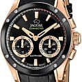 Jaguar J959/1 из коллекции Connected — это мужские гибридные часы, сочетающие классический дизайн с современными смарт-функциями. Корпус диаметром 45 мм выполнен из нержавеющей стали с розовым PVD-покрытиемPVDУльтратонкое покрытие наносится в технике вакуумного напыления, сочетает в себе нитрид титана особой прочности со слоем золота или оксида хрома. Несёт в себе декоративную или защитную функцию., что обеспечивает прочность и элегантный внешний вид. Сапфировое стеклоСапфировое стеклоПрочный и надёжный материал из кристалла сапфира синтетического происхождения, характеризующийся особой твёрдостью и устойчивостью к царапинам и повреждениям. защищает циферблат от царапин и повреждений. Чёрный циферблат с розово-золотыми индексами и стрелками подчёркивает утончённый стиль. Часы оснащены широким набором функций: шагомер, таймер, хронограф, будильник, автоматическая синхронизация часовых поясов, управление музыкой и камерой смартфона, уведомления о звонках и сообщениях, а также функция поиска телефона. Ремешок из чёрной кожи обеспечивает комфортное ношение. Классическая застёжка гарантирует надёжную фиксацию. Водозащита до 10 ATM (100 метров) делает часы подходящими для плавания и занятий водными видами спорта. Jaguar J959/1 — идеальный выбор для мужчин, которые ценят швейцарское качество и современные технологии.