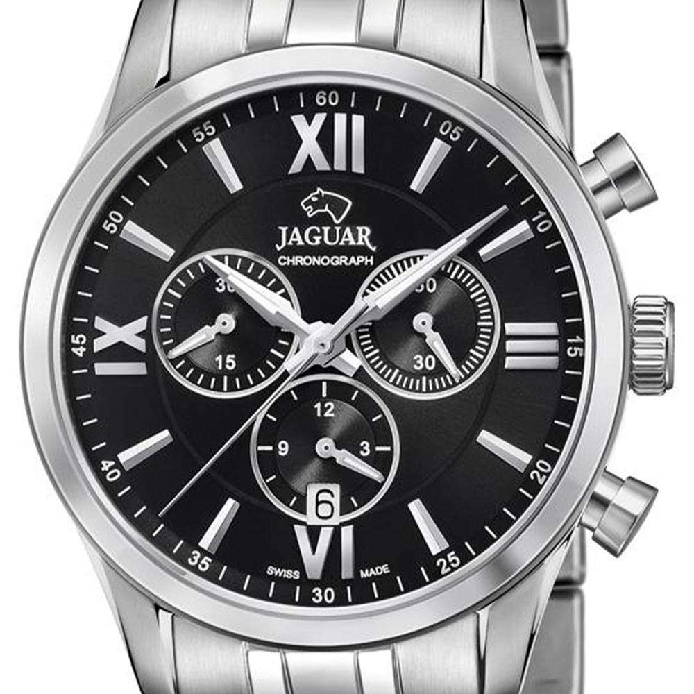 Мужские швейцарские часы-хронографХронографФункция позволяет измерять отрезки времени с особой точностью: часы, минуты, секунды. Верным признаком хронографа является наличие на циферблате 3 дополнительных окошек-счётчиков. Jaguar Acamar J963/4. Кварцевый швейцарский калибр Ronda 5030D. Сапфировое стеклоСапфировое стеклоПрочный и надёжный материал из кристалла сапфира синтетического происхождения, характеризующийся особой твёрдостью и устойчивостью к царапинам и повреждениям. устойчивое к мелким механическим повреждениям. Корпус и браслет часов изготовлены из нержавеющей стали. Окошко даты находится в положении 6 часов. Класс водозащиты: 100 метров, позволит плавать, нырять и заниматься другими водными видами спорта. Стальной браслет на раскладной застёжкеРаскладная застёжкаТакой тип застёжки используется только на браслетах из металла. Она никогда не раскрывается полностью, происходит разделение на 2 и более частей. Раскладывающая застёжка снизит вероятность потери часов к минимуму..