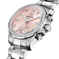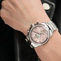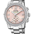 Jaguar J980/2 из коллекции Connected Lady — элегантные женские гибридные часы, сочетающие классический дизайн с современными технологиями. Корпус диаметром 37 мм выполнен из нержавеющей стали, что обеспечивает прочность и долговечность. Сапфировое стеклоСапфировое стеклоПрочный и надёжный материал из кристалла сапфира синтетического происхождения, характеризующийся особой твёрдостью и устойчивостью к царапинам и повреждениям. защищает циферблат от царапин и повреждений. Розовый циферблат с серебристыми индексами и стрелками подчёркивает изысканность дизайна. Часы оснащены функциями шагомера, уведомлений о звонках и сообщениях, управления музыкой и камерой смартфона, функции поиска телефона, а также автоматической синхронизации времени через Bluetooth. БезельБезельВнешний ободок, закрепляющий стекло. В спортивных часах так называется поворотное кольцо с делениями на циферблате, выполняет роль таймера – замеряет отрезки времени на шкале. Неподвижный безель – элемент декора. Однонаправленно вращающийся безель на дайверских часах позволяет фиксировать моменты погружения и выныривания на поверхность. инкрустирован кристаллами. Браслет из нержавеющей стали гарантирует комфортное ношение. Раскладная застёжкаРаскладная застёжкаТакой тип застёжки используется только на браслетах из металла. Она никогда не раскрывается полностью, происходит разделение на 2 и более частей. Раскладывающая застёжка снизит вероятность потери часов к минимуму. обеспечивает надёжную фиксацию. Водозащита до 5 ATM (50 метров) делает часы подходящими для повседневного использования. Jaguar J980/2 — это идеальный выбор для женщин, ценящих сочетание элегантности, функциональности и современных технологий.