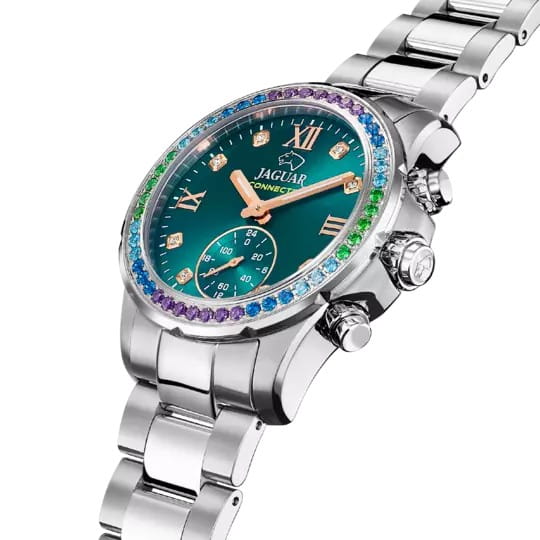 Женские швейцарские часы Jaguar Connected Lady J980/6. Сапфировое стеклоСапфировое стеклоПрочный и надёжный материал из кристалла сапфира синтетического происхождения, характеризующийся особой твёрдостью и устойчивостью к царапинам и повреждениям. устойчивое к мелким механическим повреждениям. Корпус и браслет часов изготовлены из нержавеющей стали. Стрелки и метки с люминесцентным покрытиемЛюминесцентное покрытиеПозволяет считывать показания времени в темноте. Производители наносят на стрелки, часовые индексы, безель или поверхность циферблата светонакопительный состав, дающий холодное свечение.. Класс водозащиты: 50 метров, позволит защитить корпус от случайных брызг или капель дождя. БезельБезельВнешний ободок, закрепляющий стекло. В спортивных часах так называется поворотное кольцо с делениями на циферблате, выполняет роль таймера – замеряет отрезки времени на шкале. Неподвижный безель – элемент декора. Однонаправленно вращающийся безель на дайверских часах позволяет фиксировать моменты погружения и выныривания на поверхность. и циферблат инкрустированный цирконием. Стальной браслет на раскладной застёжкеРаскладная застёжкаТакой тип застёжки используется только на браслетах из металла. Она никогда не раскрывается полностью, происходит разделение на 2 и более частей. Раскладывающая застёжка снизит вероятность потери часов к минимуму.. За точный ход работы часов, из коллекции Connected, отвечает кварцевый гибридный механизм швейцарского производства со Смарт-Модулем. Данный тип механизма обеспечивает возможность подключить часы к телефону через Bluetooth и управлять большим рядом дополнительных функций на выбор с помошью приложения Jaguar. Дополнительные функции: отображение даты и дня недели, секундомер, таймер, GMT, шагомер, поиск телефона, включение/выключение звука телефона при входящих вызовах, переключение музыки, вибро-уведомления.