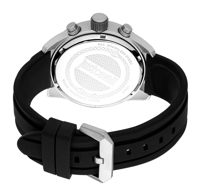 JUST CAVALLI JC1G347P0015 — стильные итальянские часы с функцией хронографаХронографФункция позволяет измерять отрезки времени с особой точностью: часы, минуты, секунды. Верным признаком хронографа является наличие на циферблате 3 дополнительных окошек-счётчиков., которые сочетают в себе элегантность и современный функционал. Круглый корпус диаметром 45 мм выполнен из нержавеющей стали, толщина корпуса составляет 12 мм, что придает модели выразительный внешний вид и надежную защиту от внешних воздействий. Часы оснащены кварцевым механизмом. Минеральное стеклоМинеральное стеклоМинеральное стекло представляет собой искусственно выращенный минерал кварца. Такое стекло отличается особой устойчивостью к повреждениям и царапинам. Уступает по некоторым качествам сапфировому стеклу. защищает часы от царапин, а водозащита 100 метров позволяет не снимать их во время плавания и занятий спортом. Силиконовый ремешок на стандартной застёжке обеспечивает комфортное ношение. Эта модель — идеальный выбор для тех, кто ценит современные технологии , классический стиль и качество.