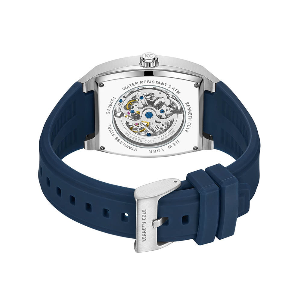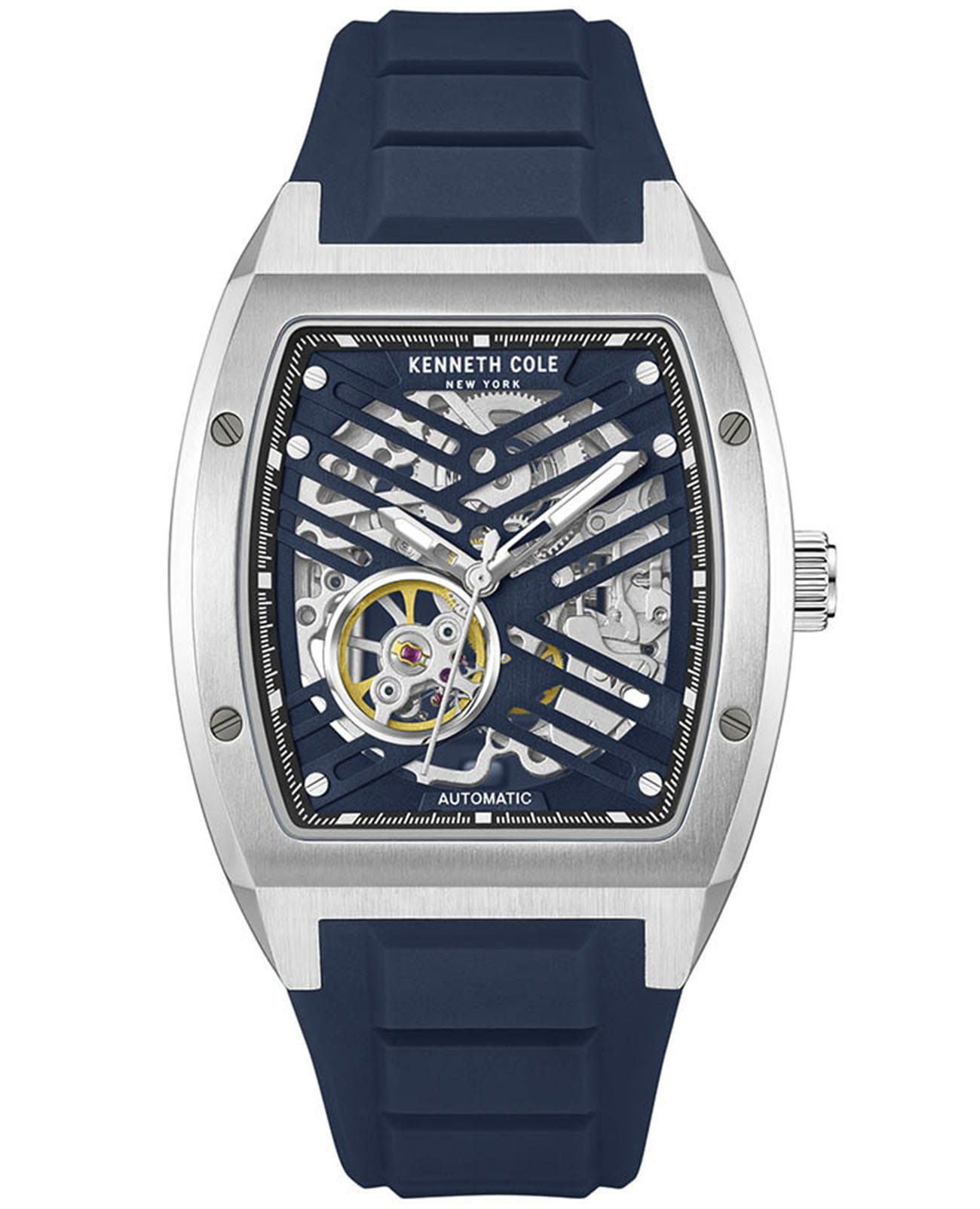Мужские механические часы с автоподзаводом Kenneth Cole KCWGZ0046101 — это стильный и современный аксессуар с выразительным дизайном. Корпус прямоугольной формы (бочка) размером 40 × 52,5 мм выполнен из нержавеющей стали. Циферблат синего цвета частично скелетонизирован, что позволяет наблюдать за работой механизма. Циферблат защищён минеральным стекломМинеральное стеклоМинеральное стекло представляет собой искусственно выращенный минерал кварца. Такое стекло отличается особой устойчивостью к повреждениям и царапинам. Уступает по некоторым качествам сапфировому стеклу., оснащён люминесцентным покрытиемЛюминесцентное покрытиеПозволяет считывать показания времени в темноте. Производители наносят на стрелки, часовые индексы, безель или поверхность циферблата светонакопительный состав, дающий холодное свечение. и оформлен метками в виде штрихов. Часы оснащены силиконовым ремешком синего цвета с классической пряжкой. Водонепроницаемость 50 м позволяет использовать часы для плавания и повседневного ношения. Стильно и практично.