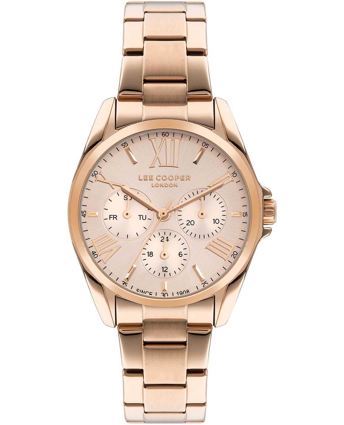Женские часы Lee Cooper LC07685.410 — это стильное сочетание элегантности и современного дизайна. Круглый корпус диаметром 36 мм выполнен из суперметалла с IP-покрытиемIP-покрытиеМетод ионного напыления. Демонстрирует повышенную устойчивость к истиранию, окислению и химическим веществам. Под воздействием высокого давления и температуры около 1500°C молекулы металла надёжно соединяются с частицами корпуса часов., придающий модели особый блеск. Золотисто-розовый циферблат с золотыми индексами защищен минеральным стекломМинеральное стеклоМинеральное стекло представляет собой искусственно выращенный минерал кварца. Такое стекло отличается особой устойчивостью к повреждениям и царапинам. Уступает по некоторым качествам сапфировому стеклу., обеспечивающим устойчивость к царапинам. Часы оснащены надежным кварцевым механизмом, а стальной браслет с IP-покрытиемIP-покрытиеМетод ионного напыления. Демонстрирует повышенную устойчивость к истиранию, окислению и химическим веществам. Под воздействием высокого давления и температуры около 1500°C молекулы металла надёжно соединяются с частицами корпуса часов. на раскладной застёжкеРаскладная застёжкаТакой тип застёжки используется только на браслетах из металла. Она никогда не раскрывается полностью, происходит разделение на 2 и более частей. Раскладывающая застёжка снизит вероятность потери часов к минимуму. гарантирует комфортную посадку на запястье. Мультифункциональная модель с индикацией даты, дня недели, с дополнительным 24-х часовым индикатором. Водозащита 30 метров защищает модель от случайных брызг и дождя. Lee Cooper — это идеальный выбор для тех, кто ценит классический стиль, точность механизма и качество материалов в одном аксессуаре.