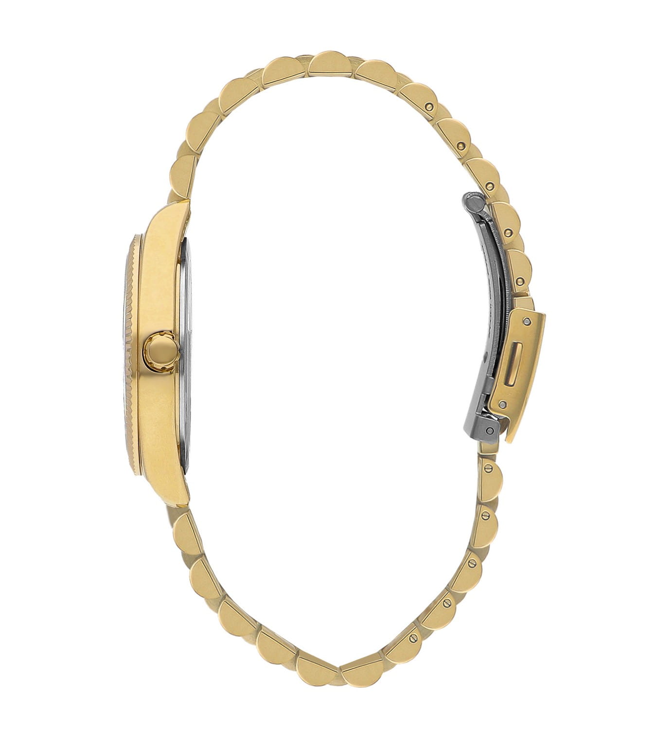 Женские часы Lee Cooper LC07811.130 — это стильное сочетание элегантности и современного дизайна. Корпус диаметром 37 мм выполнен из суперметалла с IP-покрытиемIP-покрытиеМетод ионного напыления. Демонстрирует повышенную устойчивость к истиранию, окислению и химическим веществам. Под воздействием высокого давления и температуры около 1500°C молекулы металла надёжно соединяются с частицами корпуса часов. золотого цвета, придающий модели особый блеск. Изысканный циферблат защищен минеральным стекломМинеральное стеклоМинеральное стекло представляет собой искусственно выращенный минерал кварца. Такое стекло отличается особой устойчивостью к повреждениям и царапинам. Уступает по некоторым качествам сапфировому стеклу., обеспечивающим устойчивость к царапинам. Метки в виде римских цифр. Вынесенный циферблат с 24-х часовым указателем времени, индикацией даты и дня недели. Часы оснащены надежным кварцевым механизмом, а стальной браслет с IP-покрытиемIP-покрытиеМетод ионного напыления. Демонстрирует повышенную устойчивость к истиранию, окислению и химическим веществам. Под воздействием высокого давления и температуры около 1500°C молекулы металла надёжно соединяются с частицами корпуса часов. на раскладной застёжкеРаскладная застёжкаТакой тип застёжки используется только на браслетах из металла. Она никогда не раскрывается полностью, происходит разделение на 2 и более частей. Раскладывающая застёжка снизит вероятность потери часов к минимуму. гарантирует комфортную посадку на запястье. Водозащита 50 метров защищает модель от случайных брызг и дождя. Lee Cooper  — отличный выбор для тех, кто ценит утонченность и качество.