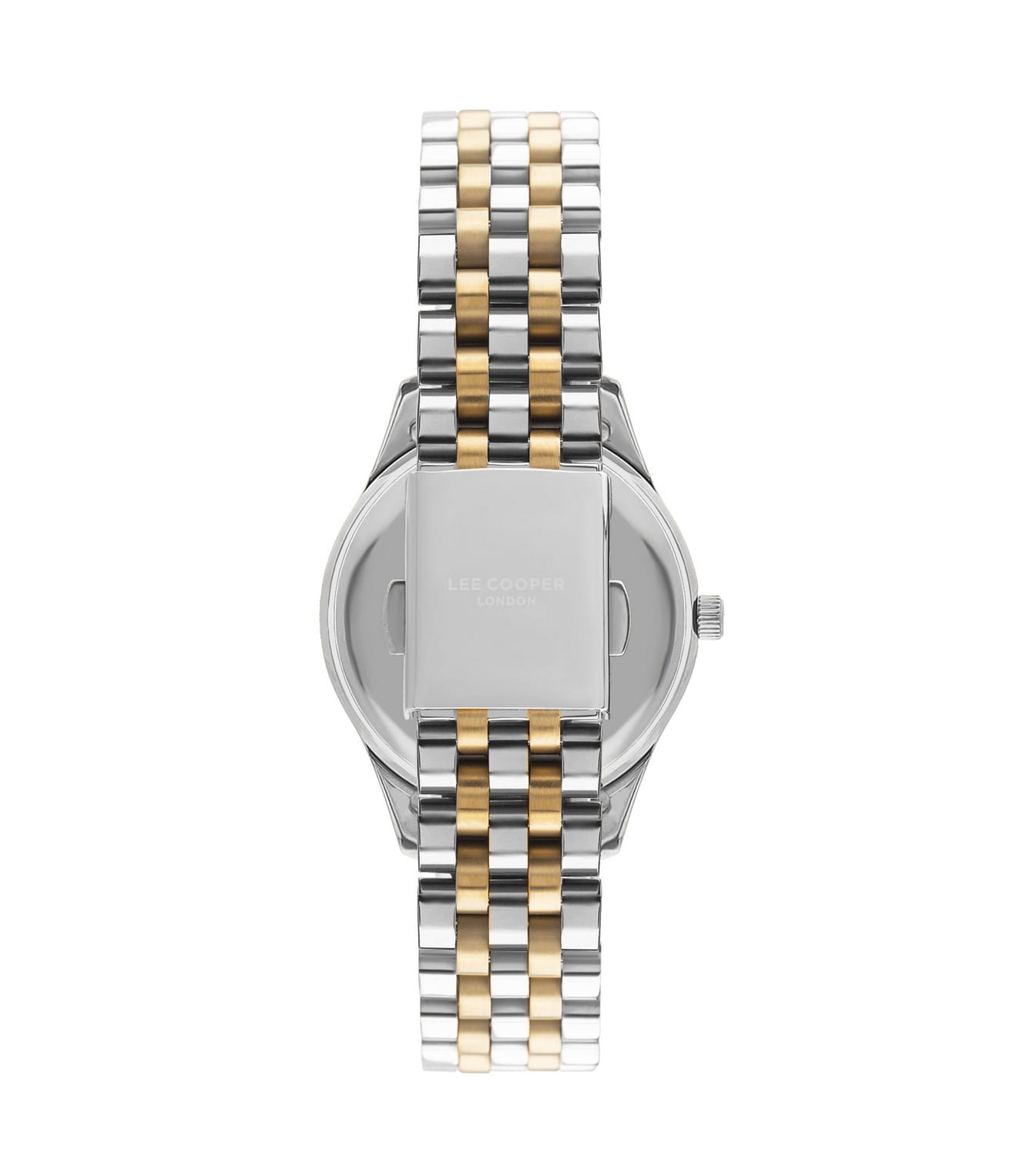 Женские часы Lee Cooper LC07826.220 выполнены в классическом стиле и сочетают строгий дизайн с надёжным механизмом. Модель оснащена кварцевым механизмом, обеспечивающим точность хода и минимальное обслуживание. Корпус круглой формы имеет размер 35 мм, изготовлен из суперметалла с изысканным неподвижным безелемБезельВнешний ободок, закрепляющий стекло. В спортивных часах так называется поворотное кольцо с делениями на циферблате, выполняет роль таймера – замеряет отрезки времени на шкале. Неподвижный безель – элемент декора. Однонаправленно вращающийся безель на дайверских часах позволяет фиксировать моменты погружения и выныривания на поверхность. с вставками из циркона, гарантирует комфорт при ношении. Циферблат дополнен изящными вставками из циркона для чёткого отсчёта времени. Защиту циферблата обеспечивает минеральное стеклоМинеральное стеклоМинеральное стекло представляет собой искусственно выращенный минерал кварца. Такое стекло отличается особой устойчивостью к повреждениям и царапинам. Уступает по некоторым качествам сапфировому стеклу., устойчивое к мелким механическим повреждениям. Стрелки с люминесцентным покрытиемЛюминесцентное покрытиеПозволяет считывать показания времени в темноте. Производители наносят на стрелки, часовые индексы, безель или поверхность циферблата светонакопительный состав, дающий холодное свечение.. Стальной браслет с частичным IP-покрытиемIP-покрытиеМетод ионного напыления. Демонстрирует повышенную устойчивость к истиранию, окислению и химическим веществам. Под воздействием высокого давления и температуры около 1500°C молекулы металла надёжно соединяются с частицами корпуса часов. на раскладной застёжкеРаскладная застёжкаТакой тип застёжки используется только на браслетах из металла. Она никогда не раскрывается полностью, происходит разделение на 2 и более частей. Раскладывающая застёжка снизит вероятность потери часов к минимуму. гарантирует удобную посадку и надёжную фиксацию на запястье. Водозащита 30WR позволяет использовать часы в повседневных условиях без риска повреждения от случайных брызг воды. Это сочетание классического дизайна, прочности материалов и качества исполнения для уверенных в себе женщин.