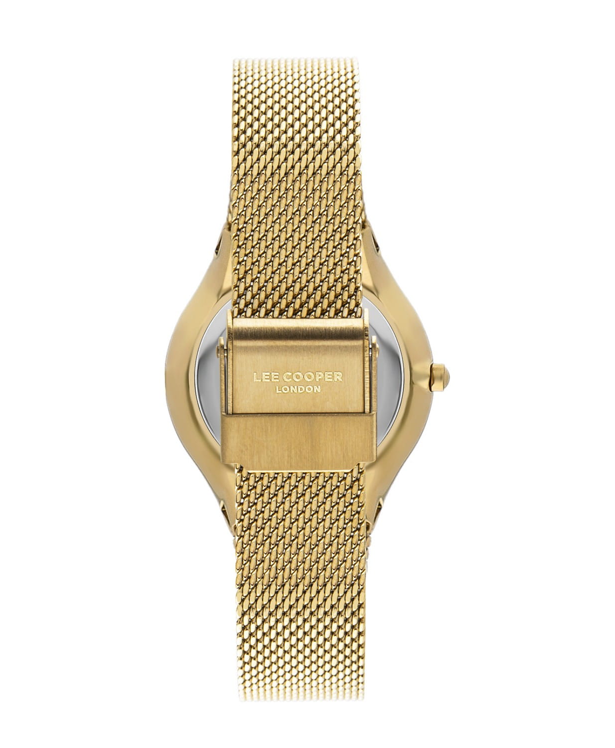 Женские часы Lee Cooper LC07862.130 — это стильное сочетание элегантности и современного дизайна. Изящный корпус диаметром 32 мм выполнен из суперметалла с IP-покрытиемIP-покрытиеМетод ионного напыления. Демонстрирует повышенную устойчивость к истиранию, окислению и химическим веществам. Под воздействием высокого давления и температуры около 1500°C молекулы металла надёжно соединяются с частицами корпуса часов. золотого цвета. Серый циферблат инкрустирован цирконами, что придает модели особый блеск и защищен минеральным стекломМинеральное стеклоМинеральное стекло представляет собой искусственно выращенный минерал кварца. Такое стекло отличается особой устойчивостью к повреждениям и царапинам. Уступает по некоторым качествам сапфировому стеклу., обеспечивающим устойчивость к царапинам. Центральные часовая, минутная стрелки. Часы оснащены надежным кварцевым механизмом. Стальной браслет с IP-покрытиемIP-покрытиеМетод ионного напыления. Демонстрирует повышенную устойчивость к истиранию, окислению и химическим веществам. Под воздействием высокого давления и температуры около 1500°C молекулы металла надёжно соединяются с частицами корпуса часов. с застежкой, выполненной в виде раскладного замкаРаскладной замокДанный вариант застежки используется только на часах с металлическим браслетом. Отличительная особенность такого крепления в том, что длина браслета становится универсальной и вы можете самостоятельно отрегулировать нужный вам размер – застежка просто двигается по браслету часов., гарантирующего комфортное и безопасное ношение. Водозащита 30 метров защищает модель от случайных брызг и дождя. Lee Cooper  — отличный выбор для тех, кто ценит утонченность и качество.