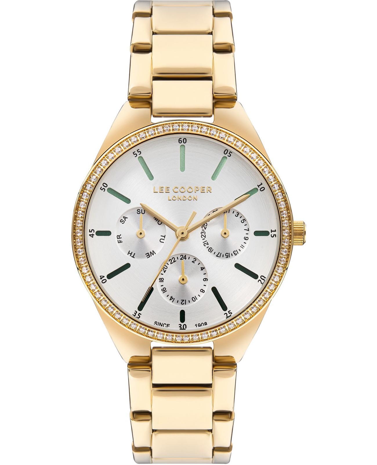 Женские часы Lee Cooper LC07863.170 — это стильное сочетание элегантности и современного дизайна. Круглый корпус диаметром 34 мм выполнен из суперметалла с IP-покрытиемIP-покрытиеМетод ионного напыления. Демонстрирует повышенную устойчивость к истиранию, окислению и химическим веществам. Под воздействием высокого давления и температуры около 1500°C молекулы металла надёжно соединяются с частицами корпуса часов. золотого цвета, а неподвижный безельБезельВнешний ободок, закрепляющий стекло. В спортивных часах так называется поворотное кольцо с делениями на циферблате, выполняет роль таймера – замеряет отрезки времени на шкале. Неподвижный безель – элемент декора. Однонаправленно вращающийся безель на дайверских часах позволяет фиксировать моменты погружения и выныривания на поверхность. украшен цирконами, придающими модели особый блеск. Серебристый циферблат защищен минеральным стекломМинеральное стеклоМинеральное стекло представляет собой искусственно выращенный минерал кварца. Такое стекло отличается особой устойчивостью к повреждениям и царапинам. Уступает по некоторым качествам сапфировому стеклу., обеспечивающим устойчивость к царапинам. Метки в виде штрихов. Часы оснащены надежным кварцевым механизмом, а металлический браслет с IP-покрытиемIP-покрытиеМетод ионного напыления. Демонстрирует повышенную устойчивость к истиранию, окислению и химическим веществам. Под воздействием высокого давления и температуры около 1500°C молекулы металла надёжно соединяются с частицами корпуса часов. на раскладной застёжкеРаскладная застёжкаТакой тип застёжки используется только на браслетах из металла. Она никогда не раскрывается полностью, происходит разделение на 2 и более частей. Раскладывающая застёжка снизит вероятность потери часов к минимуму. гарантирует комфортную посадку на запястье. Мультифункциональная модель с индикацией даты, дня недели, с дополнительным 24-х часовым индикатором. Водозащита 30 метров защищает модель от случайных брызг и дождя. Lee Cooper — отличный выбор для тех, кто ценит утонченность и качество.