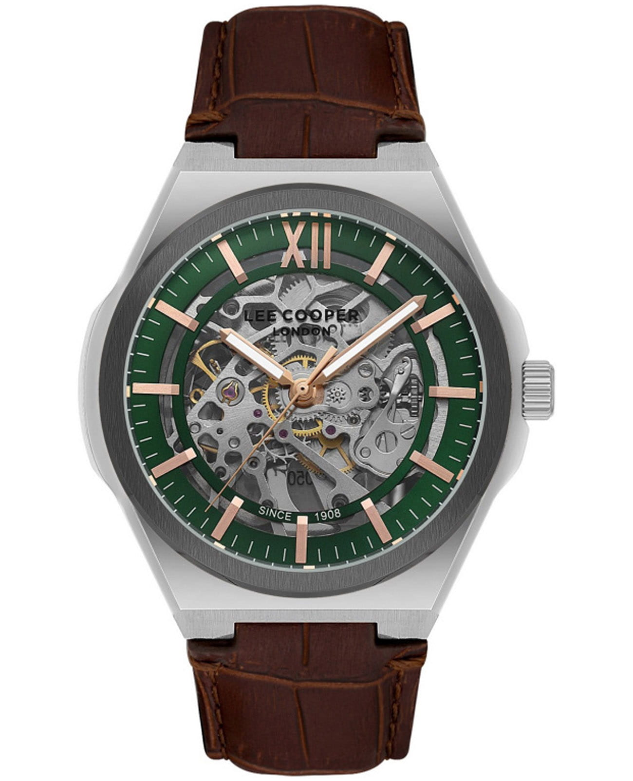 Мужские наручные часы Lee Cooper Мужские наручные часы Lee Cooper LC08050.354 — это стильная модель, сочетающая в себе современный дизайн и функциональность. Корпус часов выполнен из нержавеющей стали серебристого цвета, что делает их устойчивыми к внешним воздействиям и придает благородный вид. Часы оснащены автоподзаводом калибра G3265ZH, который заряжается от движения руки и обеспечивает высокую точность хода. Серо-зеленый циферблат украшен скелетонизированным дизайном, позволяющим наблюдать за работой механизма, что делает часы не только функциональными, но и визуально привлекательными. Для защиты циферблата используется минеральное стеклоМинеральное стеклоМинеральное стекло представляет собой искусственно выращенный минерал кварца. Такое стекло отличается особой устойчивостью к повреждениям и царапинам. Уступает по некоторым качествам сапфировому стеклу., устойчивое к царапинам и механическим повреждениям. Корпус имеет круглую форму диаметром 43 мм, что делает часы заметными и подходящими для повседневного ношения. Ремешок из натуральной кожи с тиснением "под крокодила". Застежка стандартная классическая. Модель обладает водонепроницаемостью до 50 метров (5 АТМ), что позволяет использовать часы в повседневной жизни, включая контакт с водой при мытье рук или дожде. Эти часы станут идеальным выбором для мужчин, ценящих стиль, качество и функциональность.