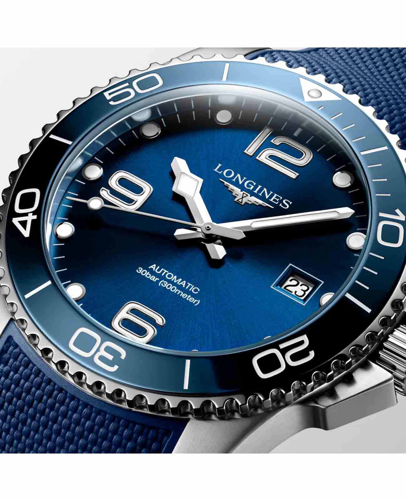Мужские механические швейцарские часы с автоподзаводом Longines HydroConquest L3.781.4.96.9. Сапфировое стеклоСапфировое стеклоПрочный и надёжный материал из кристалла сапфира синтетического происхождения, характеризующийся особой твёрдостью и устойчивостью к царапинам и повреждениям. с антибликовым покрытием, устойчивое к мелким механическим повреждениям. Корпус часов изготовлен из нержавеющей стали. Вращающийся стальной безельБезельВнешний ободок, закрепляющий стекло. В спортивных часах так называется поворотное кольцо с делениями на циферблате, выполняет роль таймера – замеряет отрезки времени на шкале. Неподвижный безель – элемент декора. Однонаправленно вращающийся безель на дайверских часах позволяет фиксировать моменты погружения и выныривания на поверхность. с люминесцентным покрытиемЛюминесцентное покрытиеПозволяет считывать показания времени в темноте. Производители наносят на стрелки, часовые индексы, безель или поверхность циферблата светонакопительный состав, дающий холодное свечение. Superluminova из нержавеющей стали с PVD-покрытиемPVDУльтратонкое покрытие наносится в технике вакуумного напыления, сочетает в себе нитрид титана особой прочности со слоем золота или оксида хрома. Несёт в себе декоративную или защитную функцию. и керамики, защищенный от царапин, никогда не изнашивается и не выцветает. Стрелки и метки с люминесцентным покрытиемЛюминесцентное покрытиеПозволяет считывать показания времени в темноте. Производители наносят на стрелки, часовые индексы, безель или поверхность циферблата светонакопительный состав, дающий холодное свечение.. Окошко даты находится в положении 3 часа. Класс водозащиты: 300 метров, позволит плавать, нырять и заниматься другими водными видами спорта. Каучковый ремешок на раскладной застёжкеРаскладная застёжкаТакой тип застёжки используется только на браслетах из металла. Она никогда не раскрывается полностью, происходит разделение на 2 и более частей. Раскладывающая застёжка снизит вероятность потери часов к минимуму..
