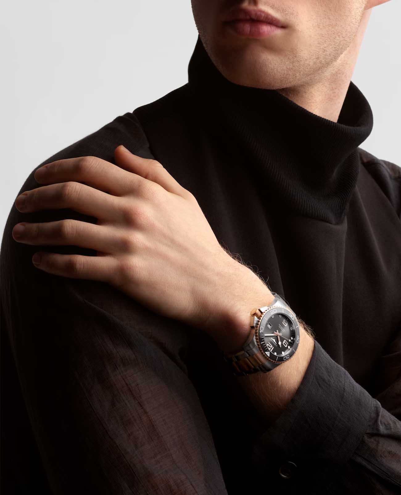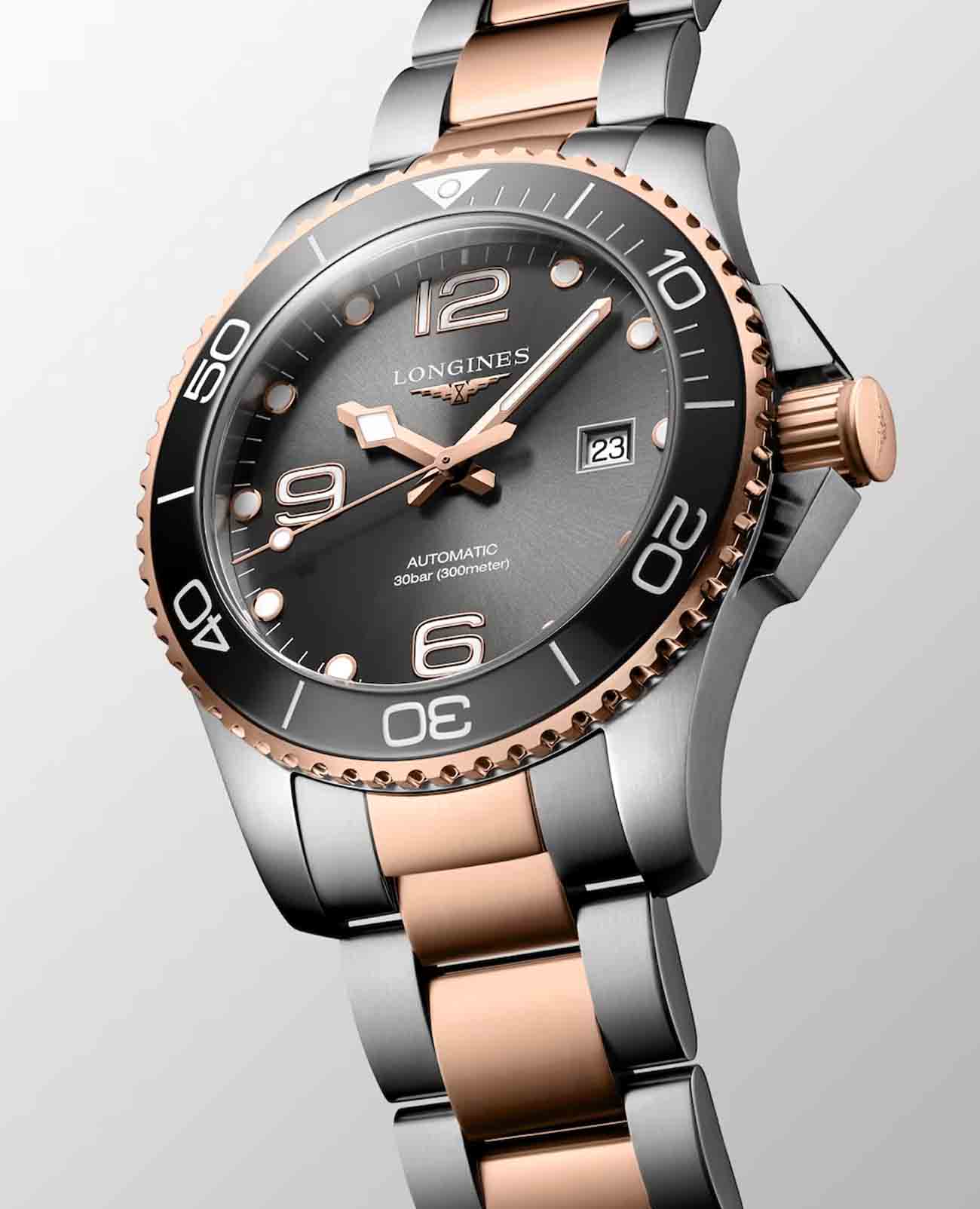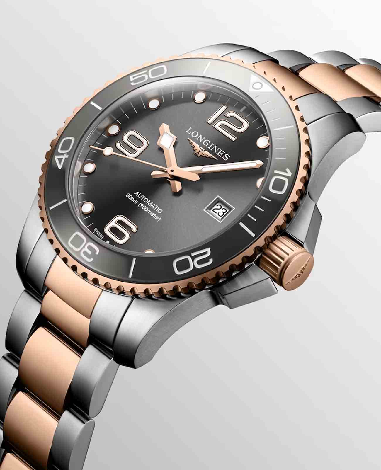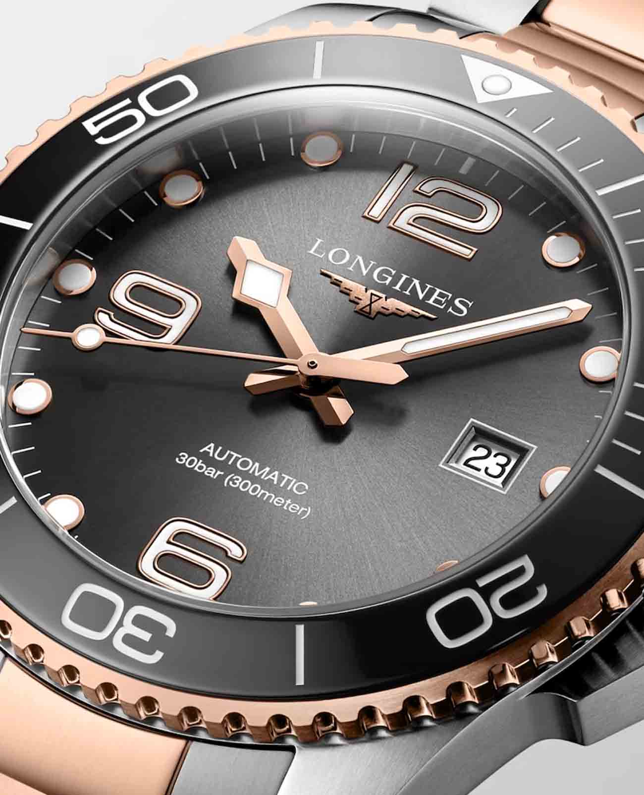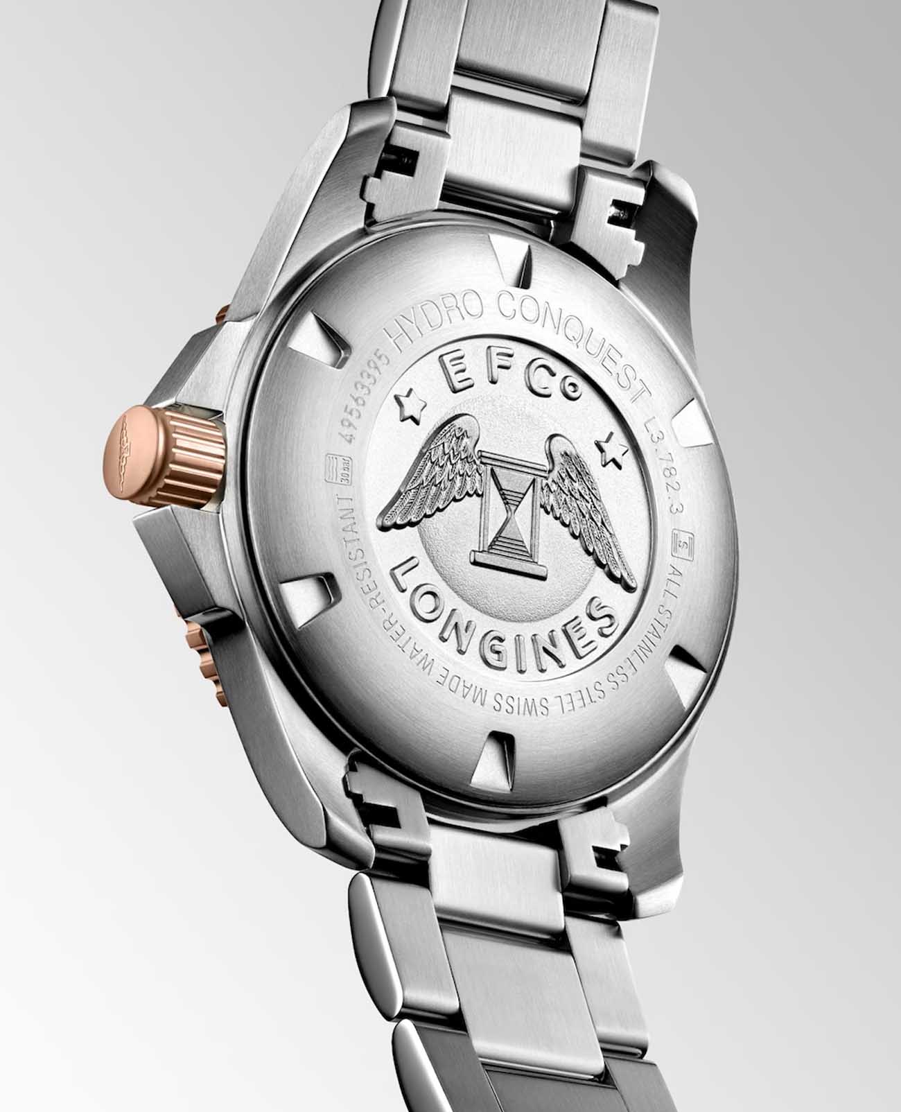 Швейцарские механические часы для дайвинга Longines HydroConquest L3.782.3.78.7. Сапфировое стеклоСапфировое стеклоПрочный и надёжный материал из кристалла сапфира синтетического происхождения, характеризующийся особой твёрдостью и устойчивостью к царапинам и повреждениям. с многослойным антибликовым покрытием с обеих сторон, устойчивое к появлению царапин, обладающее высокой прозрачностью. Корпус часов изготовлен из стали. Вращающийся безельБезельВнешний ободок, закрепляющий стекло. В спортивных часах так называется поворотное кольцо с делениями на циферблате, выполняет роль таймера – замеряет отрезки времени на шкале. Неподвижный безель – элемент декора. Однонаправленно вращающийся безель на дайверских часах позволяет фиксировать моменты погружения и выныривания на поверхность. из стали с PVD-покрытиемPVDУльтратонкое покрытие наносится в технике вакуумного напыления, сочетает в себе нитрид титана особой прочности со слоем золота или оксида хрома. Несёт в себе декоративную или защитную функцию. и керамики, защищенный от царапин, никогда не изнашивается и не выцветает. Стрелки и метки с люминесцентным покрытиемЛюминесцентное покрытиеПозволяет считывать показания времени в темноте. Производители наносят на стрелки, часовые индексы, безель или поверхность циферблата светонакопительный состав, дающий холодное свечение.. Окошко даты находится в положении 3 часов. Класс водозащиты: 300 метров, позволит плавать, нырять и заниматься другими водными видами спорта. Стальной браслет с частичным PVD-покрытиемPVDУльтратонкое покрытие наносится в технике вакуумного напыления, сочетает в себе нитрид титана особой прочности со слоем золота или оксида хрома. Несёт в себе декоративную или защитную функцию. на раскладной застёжкеРаскладная застёжкаТакой тип застёжки используется только на браслетах из металла. Она никогда не раскрывается полностью, происходит разделение на 2 и более частей. Раскладывающая застёжка снизит вероятность потери часов к минимуму..