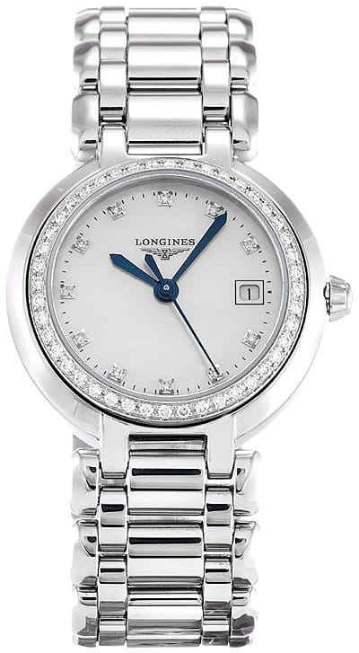 Женские швейцарские часы с бриллиантами Longines PrimaLuna L8.110.0.87.6, кварцевый механизм с высокой точностью. Сапфировое стекло устойчивое к появлению царапин, обладающее высокой прозрачностью. Класс водозащиты: 30 метров, позволит защитить корпус от случайных брызг или капель дождя. Корпус часов изготовлен из стали, серебристого цвета.
