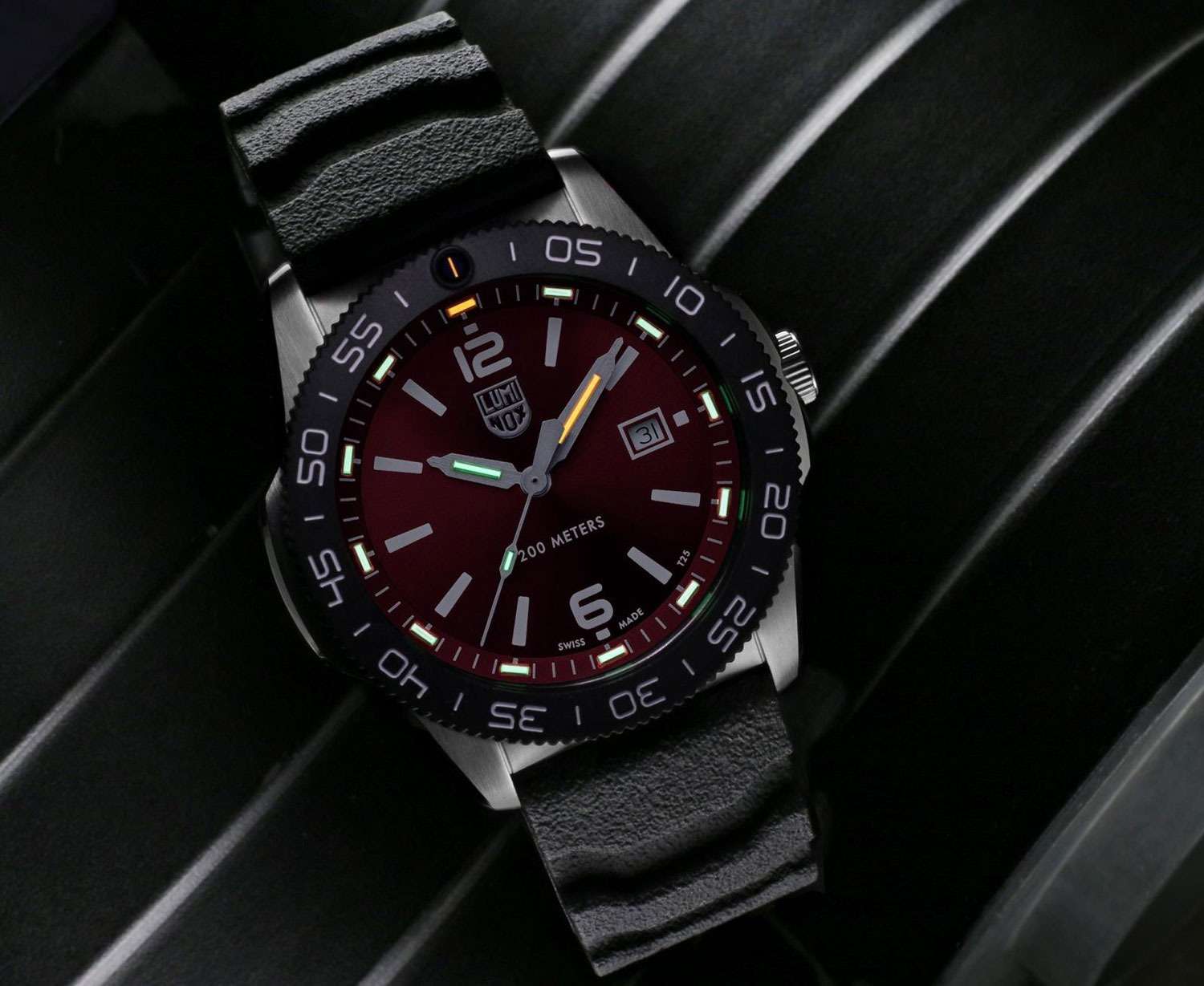 Швейцарские наручные часы Luminox Pacific Diver XS.3135 – это истинный шедевр в мире часового искусства, сочетающий в себе передовые технологии и стильный дизайн. Эти часы оснащены высокоточным кварцевым механизмом, что гарантирует точность в отслеживании времени, необходимую в условиях активного образа жизни. Защищенный сапфировым стекломСапфировое стеклоПрочный и надёжный материал из кристалла сапфира синтетического происхождения, характеризующийся особой твёрдостью и устойчивостью к царапинам и повреждениям. с с антибликовым покрытиемАнтибликовое покрытиеСлой оксида металла в 0,13-0,3 микрон, благодаря которому стекло часов не бликует и не отражает свет. Антибликовое покрытие уменьшает отражение света в 10 раз, обеспечивая отличную читаемость показателей циферблата., циферблат обеспечивает надежную защиту от царапин, сохраняя идеальную прозрачность и ясность отображения времени. Корпус часов изготовлен из прочной стали, что свидетельствует о высоком качестве материалов и устойчивости к износу. Стрелки с LLTLLTLLT — это автономный механизм подсветки, основанный на использовании микроскопических газонаполненных элементов. Специальные герметичные капсулы из боросиликатного стекла, интегрированные в циферблат, генерируют свечение без необходимости подключения к внешним источникам энергии. Для их работы не требуется ни дополнительный свет, ни механическое воздействие (например, нажатие кнопки). Свечение возникает благодаря химическому процессу: реакция между тритием, заключенным в капсулах, и люминофорным покрытием создает стабильное автономное освещение. Технология обеспечивает энергетическую независимость и долговечность подсветки.-подсветкой, позволяют легко считывать время даже в условиях недостаточного освещения, добавляя удобства в ночное время. На циферблате также предусмотрено окошко даты, расположенное в удобном положении 3 часа, что позволяет быстро и просто ориентироваться в текущей дате. С классом водозащиты 200 метров эти часы идеально подходят для любителей водных видов спорта, будь то плавание или ныряние, предоставляя уверенность в их целостности даже под водой. Каучуковый ремешок, оснащенный стандартной застежкой, обеспечивает комфортную и надежную посадку на запястье, что делает их идеальными для повседневного использования. Дизайн завершается стильным вращающимся безелемБезельВнешний ободок, закрепляющий стекло. В спортивных часах так называется поворотное кольцо с делениями на циферблате, выполняет роль таймера – замеряет отрезки времени на шкале. Неподвижный безель – элемент декора. Однонаправленно вращающийся безель на дайверских часах позволяет фиксировать моменты погружения и выныривания на поверхность. из карбонаКарбонОт «carbon», «carbone» - углерод, углепластик - полимерный композиционный материал из переплетённых под определенным углом между собой нитей углеродного волокна, применяется для изготовления лёгких, но прочных деталей. В часах часто используют для украшения циферблатов и ремешков. Так же карбон используется в изготовлении корпусов. Такие корпуса обладают антикоррозионным свойством, не поддаются электромагнитному излучению, обладают повышенной прочностью и противоударностью., который не только усиливает общий эстетический вид часов, но и придает им дополнительную 