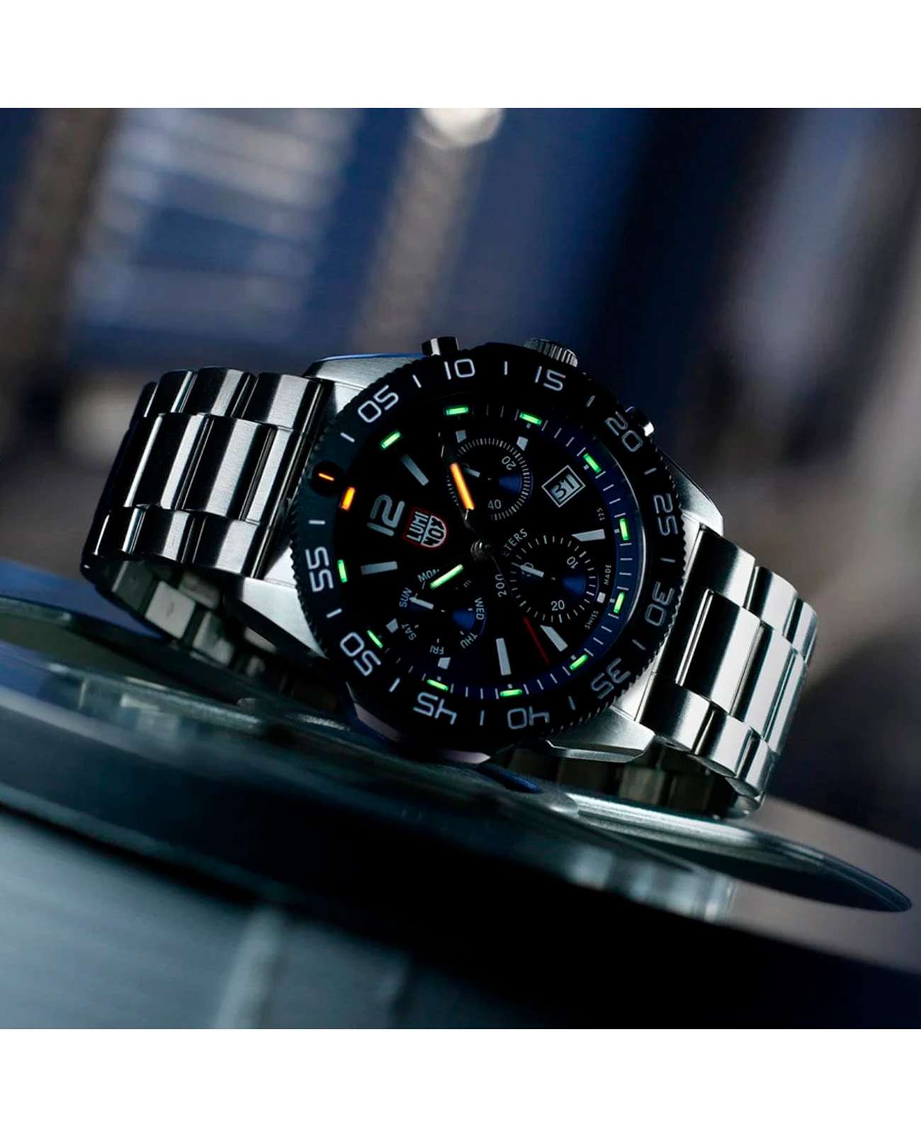 Мужские наручные часы-хронографХронографФункция позволяет измерять отрезки времени с особой точностью: часы, минуты, секунды. Верным признаком хронографа является наличие на циферблате 3 дополнительных окошек-счётчиков. Luminox XS.3144 из коллекции Pacific Diver сочетают в себе спортивный дизайн и надежность швейцарского качества . Модель обладает круглым корпусом диаметром 44 мм, изготовленным из нержавеющей стали с PVD-покрытиемPVDУльтратонкое покрытие наносится в технике вакуумного напыления, сочетает в себе нитрид титана особой прочности со слоем золота или оксида хрома. Несёт в себе декоративную или защитную функцию., что обеспечивает высокую устойчивость к внешним воздействиям и долговечность . Циферблат черного цвета украшен контрастными метками и стрелками с люминесцентным покрытиемЛюминесцентное покрытиеПозволяет считывать показания времени в темноте. Производители наносят на стрелки, часовые индексы, безель или поверхность циферблата светонакопительный состав, дающий холодное свечение., гарантирующим постоянную видимость времени даже в условиях низкой освещенности благодаря системе LLTLLTLLT — это автономный механизм подсветки, основанный на использовании микроскопических газонаполненных элементов. Специальные герметичные капсулы из боросиликатного стекла, интегрированные в циферблат, генерируют свечение без необходимости подключения к внешним источникам энергии. Для их работы не требуется ни дополнительный свет, ни механическое воздействие (например, нажатие кнопки). Свечение возникает благодаря химическому процессу: реакция между тритием, заключенным в капсулах, и люминофорным покрытием создает стабильное автономное освещение. Технология обеспечивает энергетическую независимость и долговечность подсветки. (микрогазовые огни) . Часы оснащены кварцевым механизмом швейцарского производства Ronda 515, обеспечивающим точность хода ±15 секунд в месяц . Защиту циферблата обеспечивает прочное сапфировое стеклоСапфировое стеклоПрочный и надёжный материал из кристалла сапфира синтетического происхождения, характеризующийся особой твёрдостью и устойчивостью к царапинам и повреждениям. с антибликовым покрытиемАнтибликовое покрытиеСлой оксида металла в 0,13-0,3 микрон, благодаря которому стекло часов не бликует и не отражает свет. Антибликовое покрытие уменьшает отражение света в 10 раз, обеспечивая отличную читаемость показателей циферблата., устойчивое к царапинам и механическим повреждениям . Водонепроницаемость модели достигает 20 атмосфер (200 метров), что делает их подходящими для плавания и активного отдыха на воде, включая дайвинг . Модель также оснащена безелемБезельВнешний ободок, закрепляющий стекло. В спортивных часах так называется поворотное кольцо с делениями на циферблате, выполняет роль таймера – замеряет отрезки времени на шкале. Неподвижный безель – элемент декора. Однонаправленно вращающийся безель на дайверских часах позволяет фиксировать моменты погружения и выныривания на поверхность. с односторонним вращением, что добавляет функциональности при использовании в водных условиях . Стальной браслет на раскладной застёжкеРаскладная застёжкаТакой тип застёжки используется только на браслетах из металла. Она никогда не раскрывается полностью, происходит разделение на 2 и более частей.