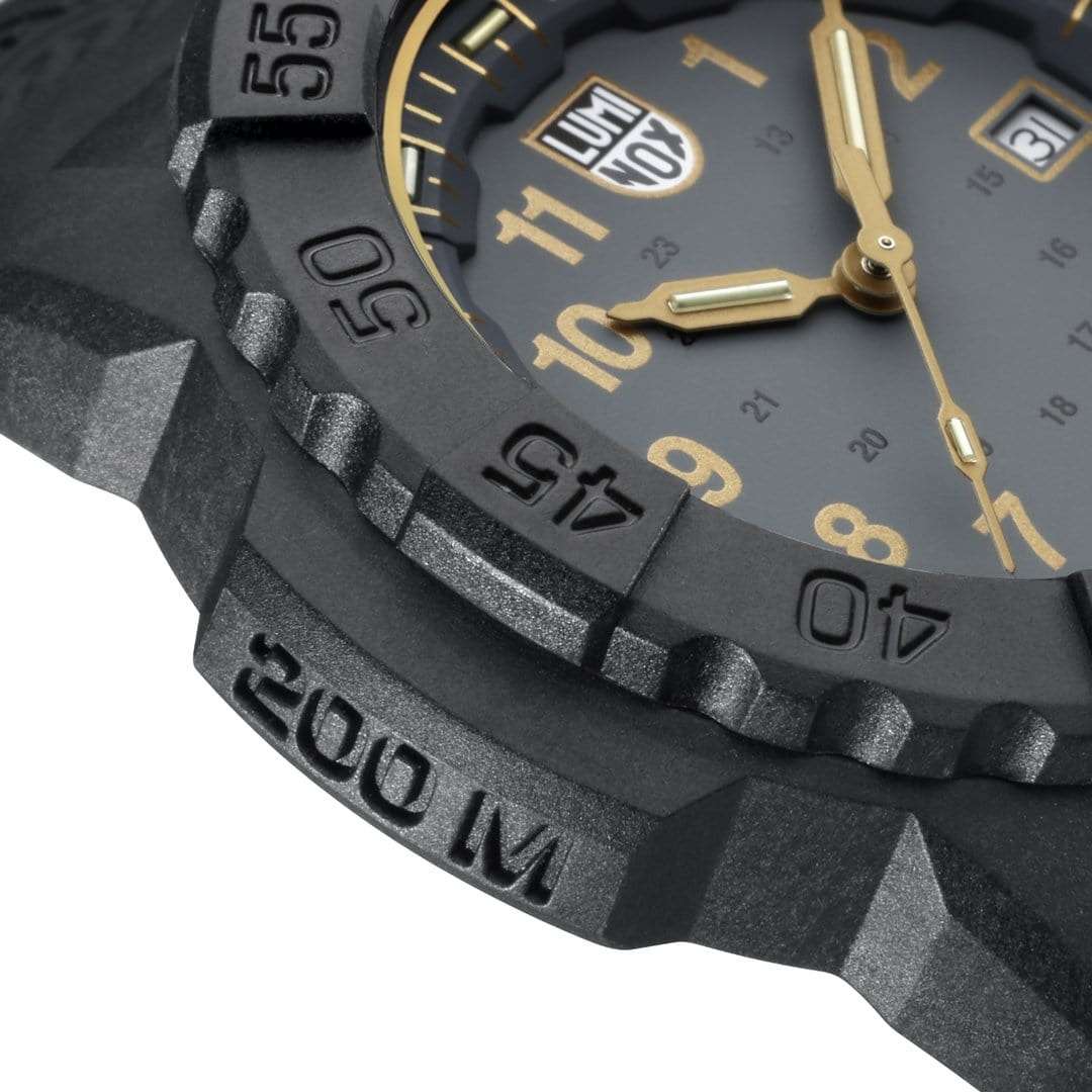 Часы Luminox XS.3508.GOLD — это надежные и стильные швейцарские часы с кварцевым механизмом, оснащенные калибром Ronda 515. Корпус выполнен из пластика, усиленного прессованным карбоном CARBONOX, что обеспечивает прочность и долговечность. Серый циферблат защищен минеральным стекломМинеральное стеклоМинеральное стекло представляет собой искусственно выращенный минерал кварца. Такое стекло отличается особой устойчивостью к повреждениям и царапинам. Уступает по некоторым качествам сапфировому стеклу. повышенной прочности, что делает его устойчивым к царапинам и ударам. Резиновый ремешок обеспечивает комфортное ношение и надежность фиксации на запястье. Эти часы обладают впечатляющим уровнем водозащиты до 200 метров, что делает их подходящими для водных видов спорта и активного отдыха. Светящаяся метка на безелеБезельВнешний ободок, закрепляющий стекло. В спортивных часах так называется поворотное кольцо с делениями на циферблате, выполняет роль таймера – замеряет отрезки времени на шкале. Неподвижный безель – элемент декора. Однонаправленно вращающийся безель на дайверских часах позволяет фиксировать моменты погружения и выныривания на поверхность., который вращается в одном направлении, добавляет функциональности и удобства, особенно в условиях низкой освещенности. Технология LLTLLTLLT — это автономный механизм подсветки, основанный на использовании микроскопических газонаполненных элементов. Специальные герметичные капсулы из боросиликатного стекла, интегрированные в циферблат, генерируют свечение без необходимости подключения к внешним источникам энергии. Для их работы не требуется ни дополнительный свет, ни механическое воздействие (например, нажатие кнопки). Свечение возникает благодаря химическому процессу: реакция между тритием, заключенным в капсулах, и люминофорным покрытием создает стабильное автономное освещение. Технология обеспечивает энергетическую независимость и долговечность подсветки.-подсветки обеспечивает отличную видимость в темноте на протяжении 25 лет, позволяя контролировать время даже при полном отсутствии света. Часы поддерживают отображение времени в 12- и 24-часовом формате, а наличие календаря с указанием числа добавляет практичности. Заводная головка снабжена защитой и двойной уплотнительной прокладкой для обеспечения герметичности, а задняя крышка крепится на винтах для дополнительной надежности.