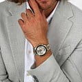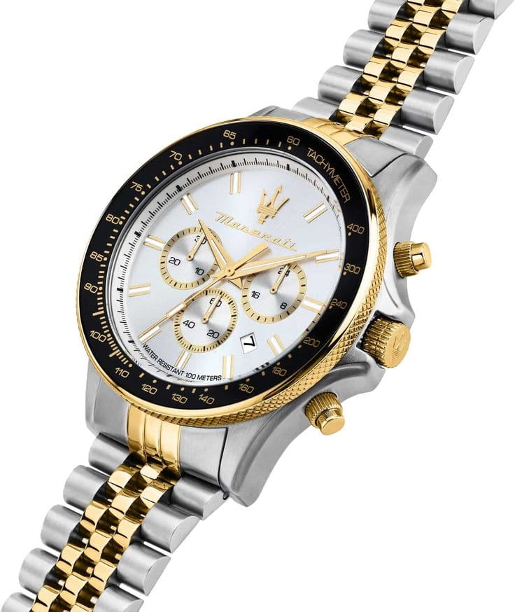 Часы Maserati Sfida R8873640024 представляют собой воплощение итальянской элегантности и технологической точности. Эти часы-хронографХронографФункция позволяет измерять отрезки времени с особой точностью: часы, минуты, секунды. Верным признаком хронографа является наличие на циферблате 3 дополнительных окошек-счётчиков. оборудованы надёжным кварцевым механизмом с калибром Miyota JS25, обеспечивающим точность и долговечность. Корпус диаметром 44 мм выполнен из стали и украшен керамической вставкой, что придаёт им современный и стильный вид. Серебристый циферблат, выполненный по технологии Sunray, эффектно играет на свету, создавая впечатление солнечных лучей. Он украшен фирменным логотипом «Maserati» и метками в виде штрихов, а также содержит окошко даты, расположенное между отметками 4 и 5 часов. Функциональность часов подчёркнута наличием секундомераСекундомерСекундоме́р — прибор, способный измерять интервалы времени с точностью до долей секунды. и возможностью выбора 12-ти или 24-х часового формата времени. БезельБезельВнешний ободок, закрепляющий стекло. В спортивных часах так называется поворотное кольцо с делениями на циферблате, выполняет роль таймера – замеряет отрезки времени на шкале. Неподвижный безель – элемент декора. Однонаправленно вращающийся безель на дайверских часах позволяет фиксировать моменты погружения и выныривания на поверхность. с золотистым и черным PVDPVDУльтратонкое покрытие наносится в технике вакуумного напыления, сочетает в себе нитрид титана особой прочности со слоем золота или оксида хрома. Несёт в себе декоративную или защитную функцию. покрытием имеет шкалу тахиметраТахиметрРазмеченная шкала, располагается на ободке или безеле часов. Тахиметр позволяет рассчитать скорость на определённом участке пути, расстояние измеряется в километрах или милях.. Люминесцентное покрытиеЛюминесцентное покрытиеПозволяет считывать показания времени в темноте. Производители наносят на стрелки, часовые индексы, безель или поверхность циферблата светонакопительный состав, дающий холодное свечение. на стрелках обеспечивает отличную видимость в темноте. Минеральное стеклоМинеральное стеклоМинеральное стекло представляет собой искусственно выращенный минерал кварца. Такое стекло отличается особой устойчивостью к повреждениям и царапинам. Уступает по некоторым качествам сапфировому стеклу. защищает циферблат, а завинчивающаяся задняя крышка и заводная головка с защитой гарантируют водозащиту до 100WR, позволяя без опасений использовать часы в различных условиях. Стальной браслет с частичным PVDPVDУльтратонкое покрытие наносится в технике вакуумного напыления, сочетает в себе нитрид титана особой прочности со слоем золота или оксида хрома. Несёт в себе декоративную или защитную функцию. покрытием и раскладной застёжкойРаскладная застёжкаТакой тип застёжки используется только на браслетах из металла. Она никогда не раскрывается полностью, происходит разделение на 2 и более частей. Раскладывающая застёжка снизит вероятность потери часов к минимуму. обеспечивает комфортное ношение и надёжную фиксацию на запястье. Эти часы идеально подойдут для тех, кто ценит стиль и функциональность в одном аксессуаре.