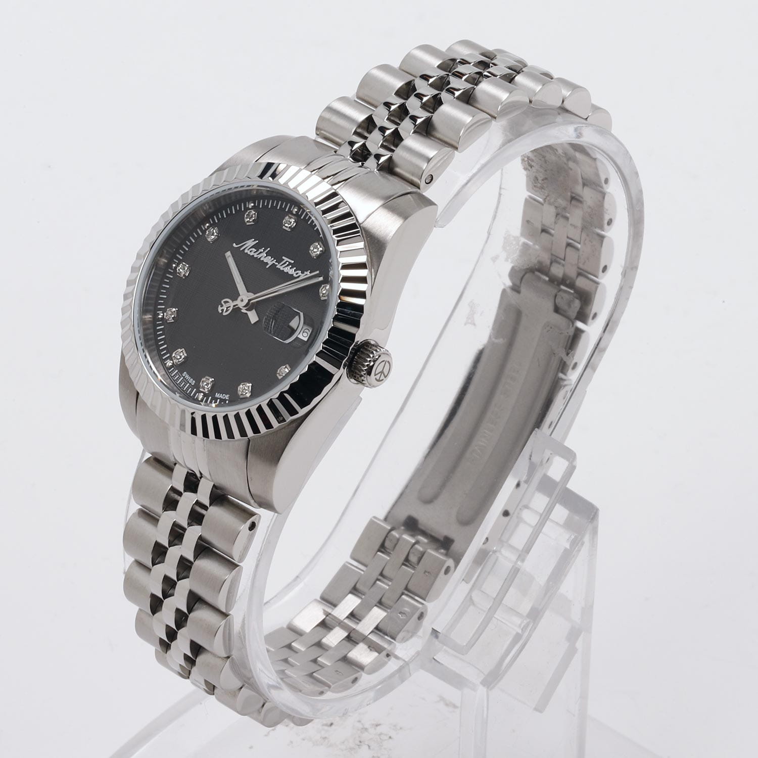 Женские кварцевые часы Mathey-Tissot Rolly D810AN — это стильное сочетание элегантности и современного дизайна. Изящный корпус выполнен из нержавеющей стали, диаметром 30 мм, что придаст образу женственности и романтизма. Изысканный циферблат с метками в виде точек придает модели особый блеск. Циферблат защищен минеральным стекломМинеральное стеклоМинеральное стекло представляет собой искусственно выращенный минерал кварца. Такое стекло отличается особой устойчивостью к повреждениям и царапинам. Уступает по некоторым качествам сапфировому стеклу., обеспечивающий устойчивость к царапинам. Стрелки с люминесцентным покрытиемЛюминесцентное покрытиеПозволяет считывать показания времени в темноте. Производители наносят на стрелки, часовые индексы, безель или поверхность циферблата светонакопительный состав, дающий холодное свечение.. Рифленый безельБезельВнешний ободок, закрепляющий стекло. В спортивных часах так называется поворотное кольцо с делениями на циферблате, выполняет роль таймера – замеряет отрезки времени на шкале. Неподвижный безель – элемент декора. Однонаправленно вращающийся безель на дайверских часах позволяет фиксировать моменты погружения и выныривания на поверхность. серебристого цвета. Циферблат украшен кристаллами. Окошко даты находится в положении 3 часа. Часы оснащены надежным кварцевым механизмом. Стальной браслет на раскладной застёжкеРаскладная застёжкаТакой тип застёжки используется только на браслетах из металла. Она никогда не раскрывается полностью, происходит разделение на 2 и более частей. Раскладывающая застёжка снизит вероятность потери часов к минимуму., гарантирует комфортное и безопасное ношение. Класс водозащиты: 50 метров позволит защитить корпус от случайных брызг или капель дождя. Mathey-Tissot — отличный выбор для тех, кто ценит утонченность и качество.