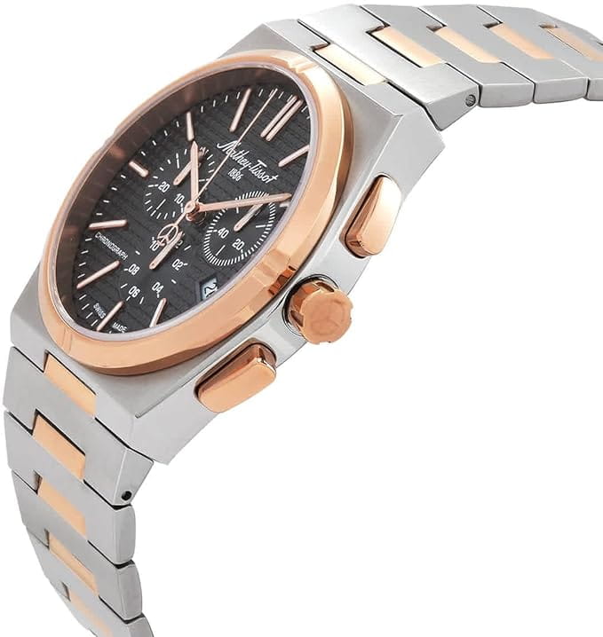 Мужские кварцевые часы-хронографХронографФункция позволяет измерять отрезки времени с особой точностью: часы, минуты, секунды. Верным признаком хронографа является наличие на циферблате 3 дополнительных окошек-счётчиков. Mathey-Tissot Zoltan H117CHRS — это стильное сочетание элегантности и современного дизайна. Изящный корпус выполнен из нержавеющей стали, диаметром 42 мм, что придаст образу элегантности и надежности. Изысканный циферблат с метками в виде штрихов придает модели особый блеск. Циферблат защищен сапфировым стекломСапфировое стеклоПрочный и надёжный материал из кристалла сапфира синтетического происхождения, характеризующийся особой твёрдостью и устойчивостью к царапинам и повреждениям., обеспечивающий устойчивость к царапинам. Неподвижный безельБезельВнешний ободок, закрепляющий стекло. В спортивных часах так называется поворотное кольцо с делениями на циферблате, выполняет роль таймера – замеряет отрезки времени на шкале. Неподвижный безель – элемент декора. Однонаправленно вращающийся безель на дайверских часах позволяет фиксировать моменты погружения и выныривания на поверхность. с PVD-покрытиемPVDУльтратонкое покрытие наносится в технике вакуумного напыления, сочетает в себе нитрид титана особой прочности со слоем золота или оксида хрома. Несёт в себе декоративную или защитную функцию. цвета розового золота. Стрелки и метки с люминесцентным покрытиемЛюминесцентное покрытиеПозволяет считывать показания времени в темноте. Производители наносят на стрелки, часовые индексы, безель или поверхность циферблата светонакопительный состав, дающий холодное свечение.. Окошко даты находится в положении 4 часа. Часы оснащены надежным кварцевым механизмом. Стальной браслет с частичным PVD-покрытиемPVDУльтратонкое покрытие наносится в технике вакуумного напыления, сочетает в себе нитрид титана особой прочности со слоем золота или оксида хрома. Несёт в себе декоративную или защитную функцию. на застёжке-бабочке с кнопкамиЗастёжка "бабочка"Такой вид застёжки дополняется предохранителями, помогающими избежать случайного раскрытия браслета. Обладают изящным исполнением. , гарантирует комфортное и безопасное ношение. Класс водозащиты: 50 метров позволит защитить корпус от случайных брызг или капель дождя. Mathey-Tissot  — отличный выбор для тех, кто ценит утонченность и качество.