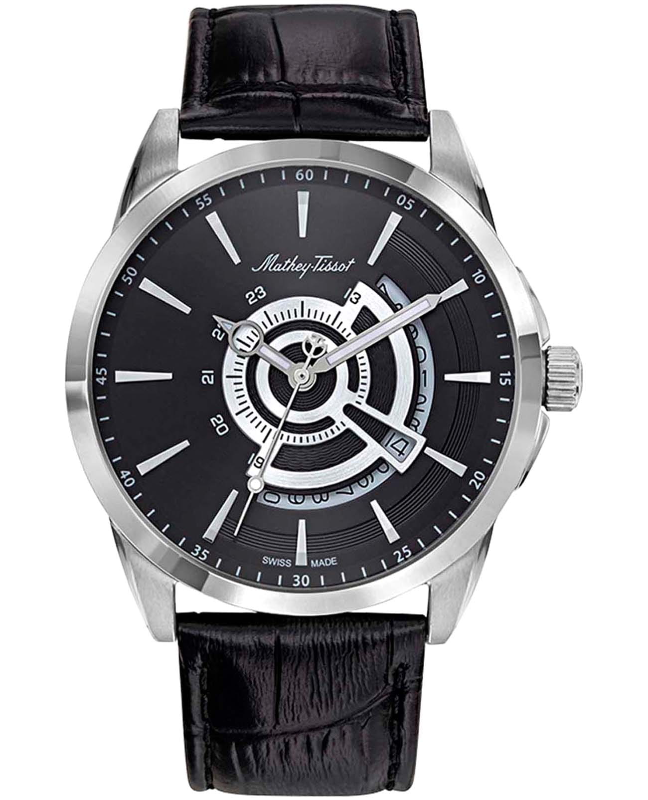 Мужские кварцевые часы Mathey-Tissot Mondo H711AN — это стильное сочетание элегантности и современного дизайна. Изящный корпус выполнен из нержавеющей стали, диаметром 42 мм, что придаст образу элегантности и надежности. Изысканный циферблат с метками в виде штрихов придает модели особый блеск. Циферблат защищен минеральным стекломМинеральное стеклоМинеральное стекло представляет собой искусственно выращенный минерал кварца. Такое стекло отличается особой устойчивостью к повреждениям и царапинам. Уступает по некоторым качествам сапфировому стеклу., обеспечивает устойчивость к царапинам. Стрелки с люминесцентным покрытиемЛюминесцентное покрытиеПозволяет считывать показания времени в темноте. Производители наносят на стрелки, часовые индексы, безель или поверхность циферблата светонакопительный состав, дающий холодное свечение.. Окошко даты находится в положении 4 часа. Рифленая заводная головка. Часы оснащены надежным кварцевым механизмом. Кожаный ремешок на стандартной застёжке гарантирует комфортное и безопасное ношение. Класс водозащиты: 50 метров позволит защитить корпус от случайных брызг или капель дождя. Mathey-Tissot  — отличный выбор для тех, кто ценит утонченность и качество.