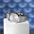 Maurice Lacroix 1975 756008-SS002-130-1 — изящная модель в винтажном стиле с современным исполнением и безупречным вниманием к деталям. Корпус диаметром 40 мм изготовлен из нержавеющей стали с сочетанием полированной и сатинированной отделки. Элегантные пропорции подчёркнуты тонким профилем. Циферблат защищён сапфировым стекломСапфировое стеклоПрочный и надёжный материал из кристалла сапфира синтетического происхождения, характеризующийся особой твёрдостью и устойчивостью к царапинам и повреждениям. с двойным антибликовым покрытиемАнтибликовое покрытиеСлой оксида металла в 0,13-0,3 микрон, благодаря которому стекло часов не бликует и не отражает свет. Антибликовое покрытие уменьшает отражение света в 10 раз, обеспечивая отличную читаемость показателей циферблата., обеспечивающим высокую прозрачность. Циферблат с солнечным узором оформлен в духе 70-х годов: родиевые стрелки, скошенные индексы и окно даты на «3 часах». Внутри установлен швейцарский кварцевый механизм, отличающийся стабильностью и точностью. Модель на стальном браслете с застёжкой «бабочка» с кнопкамиЗастёжка "бабочка"Такой вид застёжки дополняется предохранителями, помогающими избежать случайного раскрытия браслета. Обладают изящным исполнением. для надёжной и комфортной посадки. Водонепроницаемость до 100 метров делает часы практичными для ежедневного ношения. Maurice Lacroix 1975 — утончённая ретро-эстетика с акцентом на стиль и комфорт.