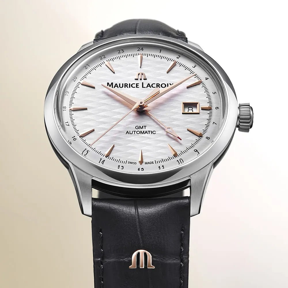 Мужские механические часы Maurice Lacroix 1975 Automatic Vagues Du Jura GMT 756048-SS001-130-2 — это стильный аксессуар, вдохновлённый элегантностью прошлого. Модель выполнена в круглой форме из нержавеющей стали диаметром 40 мм и толщиной 10 мм, что делает её прочной и устойчивой к царапинам. Циферблат серебристого цвета дополнен рисунком «волн Jura», а его поверхность защищена сапфировым стекломСапфировое стеклоПрочный и надёжный материал из кристалла сапфира синтетического происхождения, характеризующийся особой твёрдостью и устойчивостью к царапинам и повреждениям. с двусторонним антибликовым покрытиемАнтибликовое покрытиеСлой оксида металла в 0,13-0,3 микрон, благодаря которому стекло часов не бликует и не отражает свет. Антибликовое покрытие уменьшает отражение света в 10 раз, обеспечивая отличную читаемость показателей циферблата., устойчивым к повреждениям. Стрелки и индексы имеют PVD-покрытиеPVDУльтратонкое покрытие наносится в технике вакуумного напыления, сочетает в себе нитрид титана особой прочности со слоем золота или оксида хрома. Несёт в себе декоративную или защитную функцию. цвета розового золота, а секундная стрелка также покрыта этим материалом. Часы оснащены автоматическим механизмом ML165, обеспечивающим запас хода до 56 часов и частоту колебаний 28 800 полуколебаний в час. Функциональность модели включает отображение времени (часы, минуты, секунды), даты в положении 3 часов. Задняя крышка имеет специальную гравировку. Браслет из чёрной кожи шириной 20 мм оснащён раскладной застёжкойРаскладная застёжкаТакой тип застёжки используется только на браслетах из металла. Она никогда не раскрывается полностью, происходит разделение на 2 и более частей. Раскладывающая застёжка снизит вероятность потери часов к минимуму., обеспечивающей комфорт и надёжную фиксацию на запястье. Водонепроницаемость позволяет использовать модель при мытье рук или под лёгким дождём. Гарантия 2 года подтверждает качество и долговечность изделия. Эти часы станут универсальным аксессуаром для тех, кто ценит сочетание стиля, функциональности и швейцарского мастерства — идеальный выбор для повседневной носки и активного образа жизни.