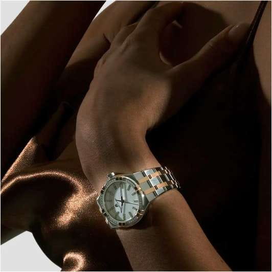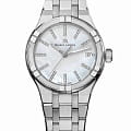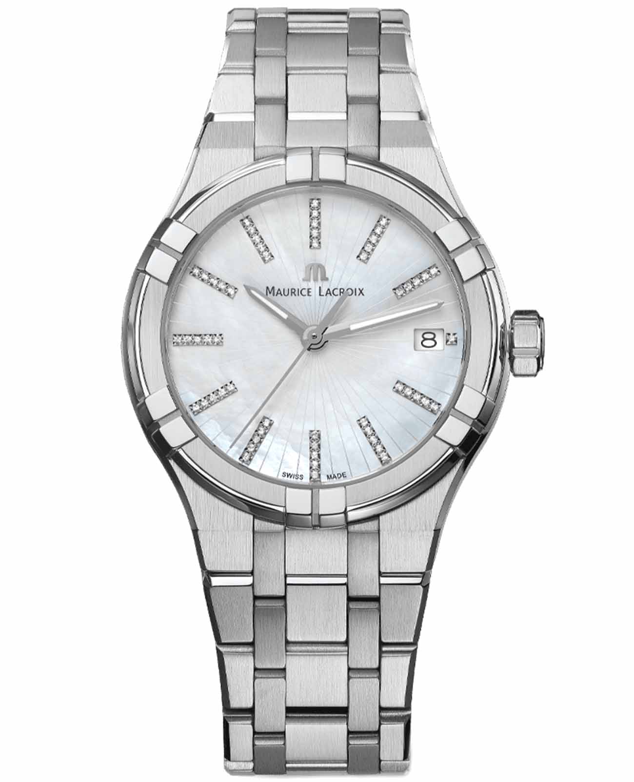 Швейцарские часы Maurice Lacroix Aikon AI1106-SS002-170-1, воплощающие современный стиль и безупречное швейцарское качество. Эти часы вдохновлены знаковой моделью Calypso из 90-х и представляют собой гармоничное сочетание смелого городского дизайна и мастерства исполнения. Корпус диаметром 35 мм выполнен из нержавеющей стали с изысканным сочетанием матовой и полированной отделки. Высота корпуса составляет всего 9 мм, что делает модель элегантной и удобной в ношении. Сапфировое стеклоСапфировое стеклоПрочный и надёжный материал из кристалла сапфира синтетического происхождения, характеризующийся особой твёрдостью и устойчивостью к царапинам и повреждениям. с двойным антибликовым покрытиемАнтибликовое покрытиеСлой оксида металла в 0,13-0,3 микрон, благодаря которому стекло часов не бликует и не отражает свет. Антибликовое покрытие уменьшает отражение света в 10 раз, обеспечивая отличную читаемость показателей циферблата. надежно защищает циферблат из белого перламутра, украшенного 56 бриллиантами. Часы также имеют заднюю крышку с особой гравировкой и безельБезельВнешний ободок, закрепляющий стекло. В спортивных часах так называется поворотное кольцо с делениями на циферблате, выполняет роль таймера – замеряет отрезки времени на шкале. Неподвижный безель – элемент декора. Однонаправленно вращающийся безель на дайверских часах позволяет фиксировать моменты погружения и выныривания на поверхность. с эффектным дизайном из шести "когтей". Стрелки с люминесцентным покрытиемЛюминесцентное покрытиеПозволяет считывать показания времени в темноте. Производители наносят на стрелки, часовые индексы, безель или поверхность циферблата светонакопительный состав, дающий холодное свечение., что облегчает чтение времени даже в условиях слабого освещения. На 3 часах расположено окошко с указателем даты. Часы оснащены кварцевым механизмом, обеспечивающим точный ход. Водостойкость до 10 ATM позволяет не беспокоиться о воздействии воды в повседневной жизни. Часы комплектуются браслетом из нержавеющей стали, и застежка «бабочка»Застёжка "бабочка"Такой вид застёжки дополняется предохранителями, помогающими избежать случайного раскрытия браслета. Обладают изящным исполнением. , раскладывающаяся при нажатии кнопок двойной блокировки и гравировкой Maurice Lacroix завершают образ, обеспечивая удобство и стиль.