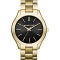 Женские американские часы Michael Kors Slim Runway MK3478, кварцевый механизм с высокой точностью. Минеральное стеклоМинеральное стеклоМинеральное стекло представляет собой искусственно выращенный минерал кварца. Такое стекло отличается особой устойчивостью к повреждениям и царапинам. Уступает по некоторым качествам сапфировому стеклу., устойчивое к мелким механическим повреждениям. Корпус часов выполнен из нержавеющей стали с PVD-покрытиемPVDУльтратонкое покрытие наносится в технике вакуумного напыления, сочетает в себе нитрид титана особой прочности со слоем золота или оксида хрома. Несёт в себе декоративную или защитную функцию.. Класс водозащиты: 50 метров, позволит защитить корпус от случайных брызг или капель дождя. Стальной браслет с PVD-покрытиемPVDУльтратонкое покрытие наносится в технике вакуумного напыления, сочетает в себе нитрид титана особой прочности со слоем золота или оксида хрома. Несёт в себе декоративную или защитную функцию. на раскладной застёжкеРаскладная застёжкаТакой тип застёжки используется только на браслетах из металла. Она никогда не раскрывается полностью, происходит разделение на 2 и более частей. Раскладывающая застёжка снизит вероятность потери часов к минимуму..