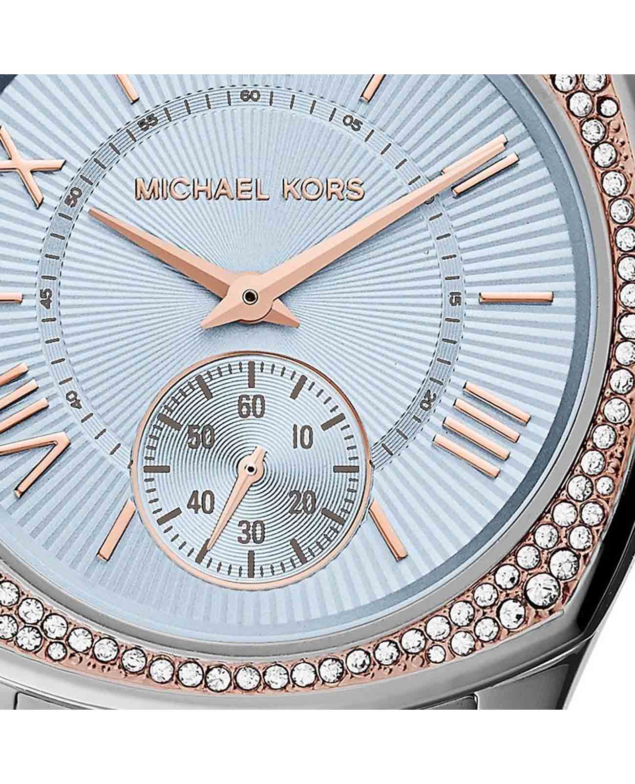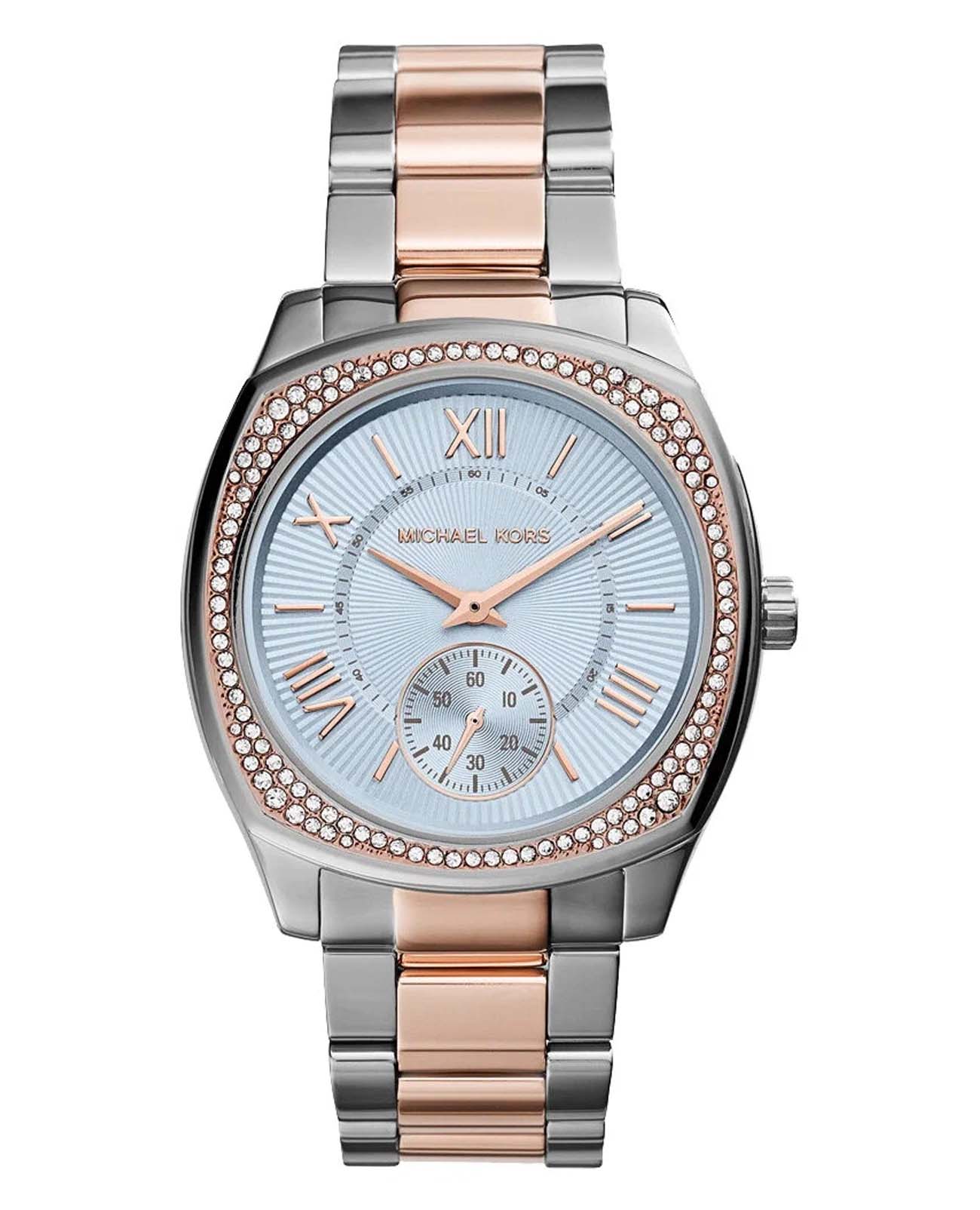 Женские американские часы Michael Kors Bryn MK6136, кварцевый механизм с высокой точностью. Минеральное стеклоМинеральное стеклоМинеральное стекло представляет собой искусственно выращенный минерал кварца. Такое стекло отличается особой устойчивостью к повреждениям и царапинам. Уступает по некоторым качествам сапфировому стеклу., устойчивое к мелким механическим повреждениям. Корпус часов выполнен из нержавеющей стали. БезельБезельВнешний ободок, закрепляющий стекло. В спортивных часах так называется поворотное кольцо с делениями на циферблате, выполняет роль таймера – замеряет отрезки времени на шкале. Неподвижный безель – элемент декора. Однонаправленно вращающийся безель на дайверских часах позволяет фиксировать моменты погружения и выныривания на поверхность. из стали с PVD-покрытиемPVDУльтратонкое покрытие наносится в технике вакуумного напыления, сочетает в себе нитрид титана особой прочности со слоем золота или оксида хрома. Несёт в себе декоративную или защитную функцию. украшен кристаллами. Секундная стрелка вынесена на отдельный циферблат. Класс водозащиты: 50 метров, позволит защитить корпус от случайных брызг или капель дождя. Стальной браслет с частичным PVD-покрытиемPVDУльтратонкое покрытие наносится в технике вакуумного напыления, сочетает в себе нитрид титана особой прочности со слоем золота или оксида хрома. Несёт в себе декоративную или защитную функцию. на раскладной застёжкеРаскладная застёжкаТакой тип застёжки используется только на браслетах из металла. Она никогда не раскрывается полностью, происходит разделение на 2 и более частей. Раскладывающая застёжка снизит вероятность потери часов к минимуму..