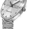 Серебристый циферблат с фирменным логотипом Mido 1950-х годов украшен накладными индексами и стрелками  с люминесцентным покрытиемЛюминесцентное покрытиеПозволяет считывать показания времени в темноте. Производители наносят на стрелки, часовые индексы, безель или поверхность циферблата светонакопительный состав, дающий холодное свечение., обеспечивающим читаемость даже в условиях слабого освещения. На «3 часах» расположено двойное окошко календаря — день недели и дата. Стальной браслет на раскладной застёжкеРаскладная застёжкаТакой тип застёжки используется только на браслетах из металла. Она никогда не раскрывается полностью, происходит разделение на 2 и более частей. Раскладывающая застёжка снизит вероятность потери часов к минимуму..