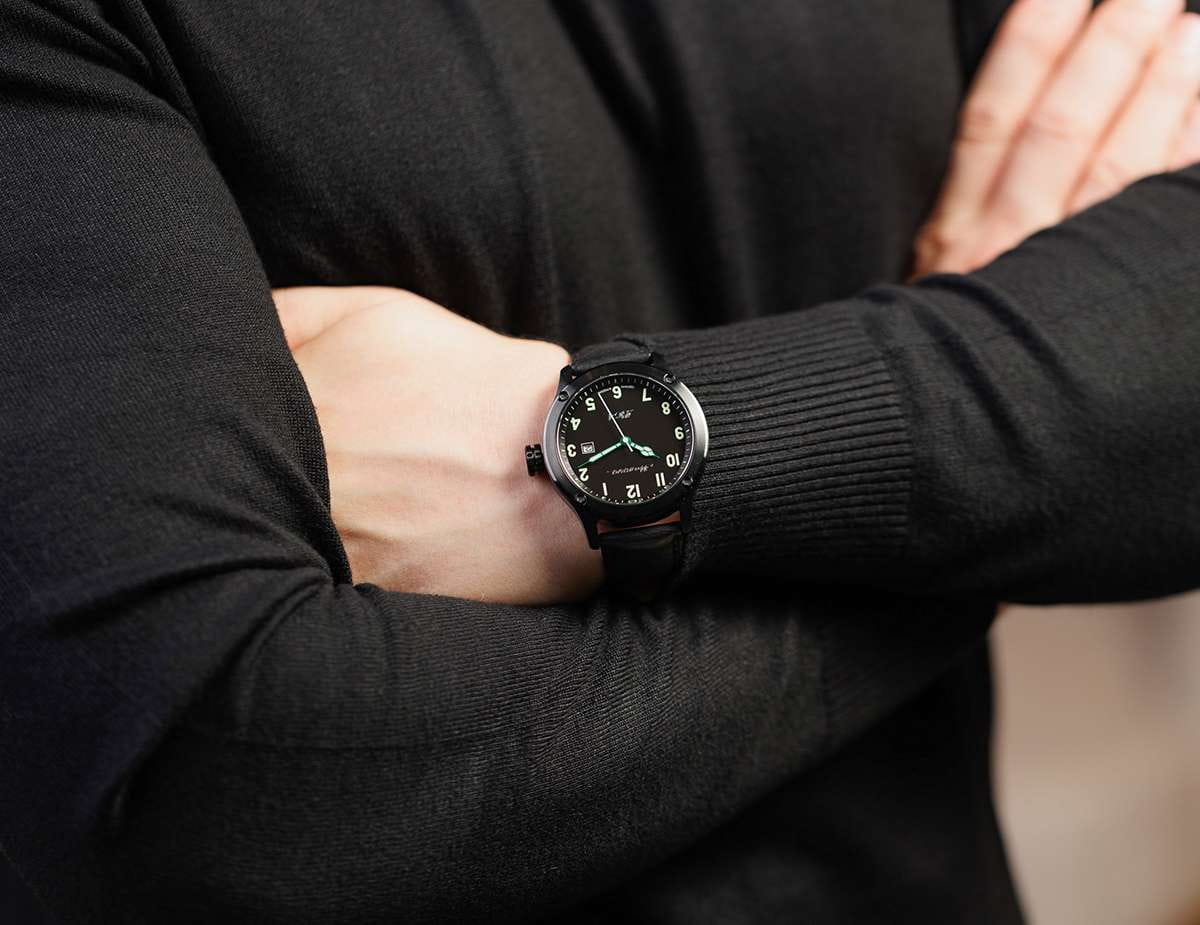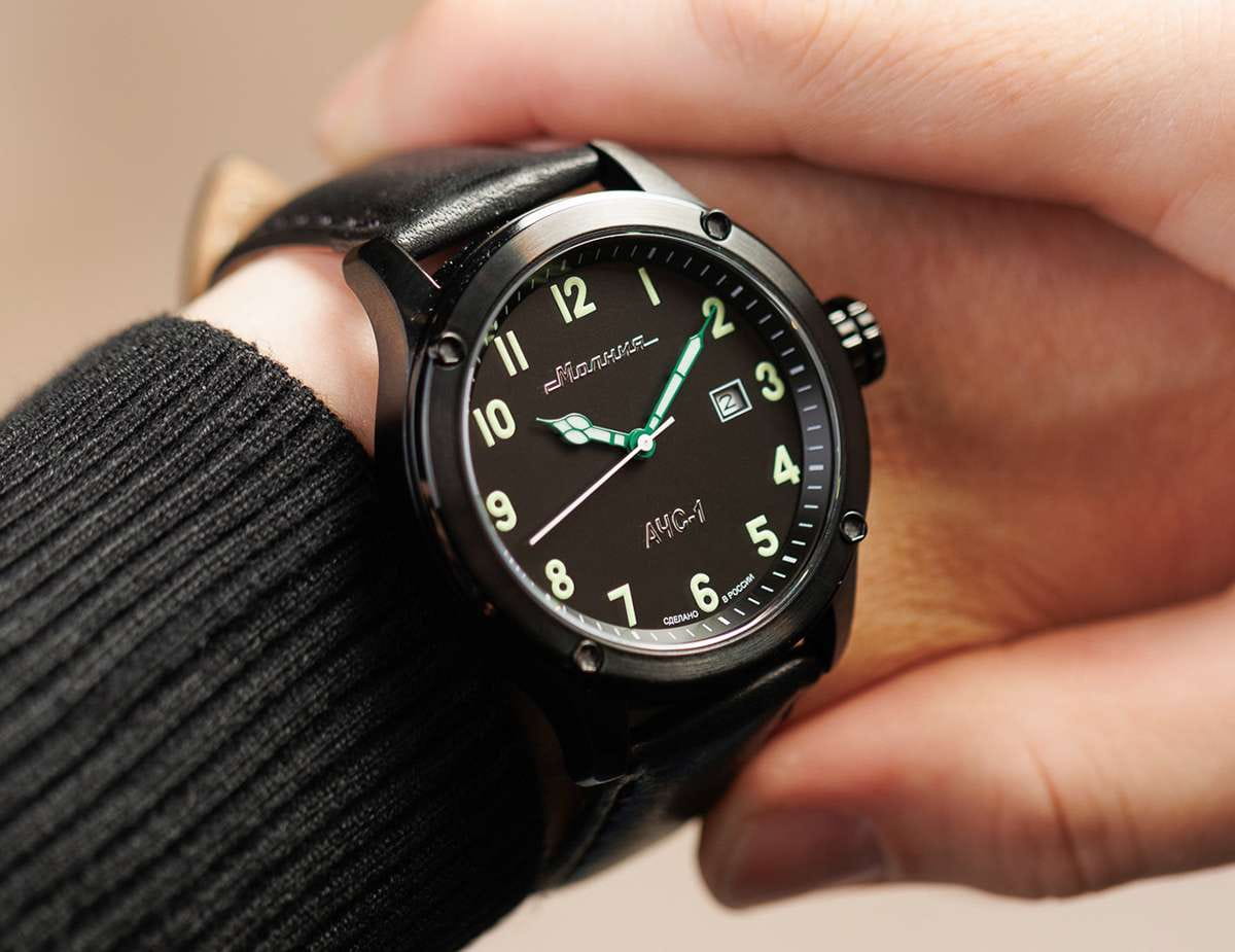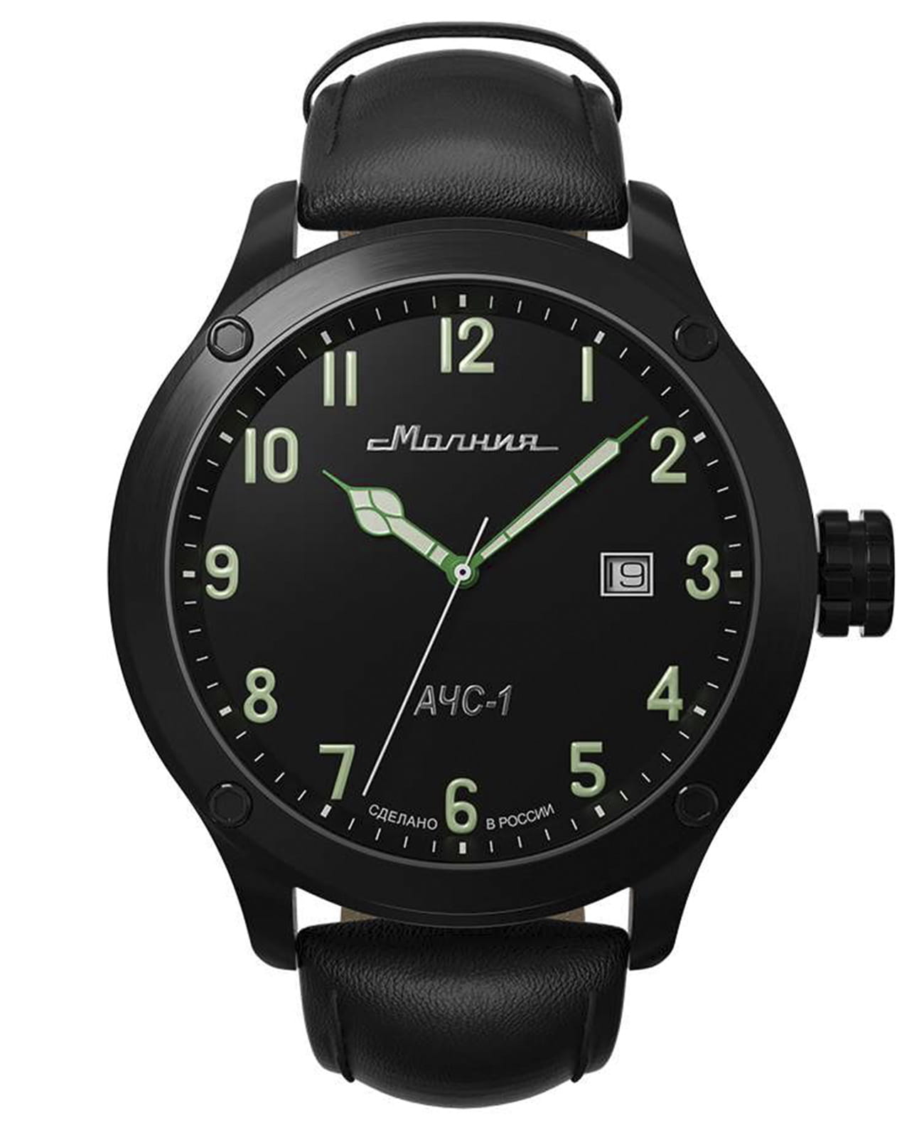 Мужские механические часы с автоподзаводом — это надёжный аксессуар от легендарного бренда «МОЛНИЯ», созданного на Челябинском часовом заводе. Корпус диаметром 44 мм и высотой 12 мм выполнен из нержавеющей стали 316L с IP-покрытиемIP-покрытиеМетод ионного напыления. Демонстрирует повышенную устойчивость к истиранию, окислению и химическим веществам. Под воздействием высокого давления и температуры около 1500°C молекулы металла надёжно соединяются с частицами корпуса часов.. Циферблат чёрного цвета матовый, оформлен стрелками и индексами с люминесцентным покрытиемЛюминесцентное покрытиеПозволяет считывать показания времени в темноте. Производители наносят на стрелки, часовые индексы, безель или поверхность циферблата светонакопительный состав, дающий холодное свечение. Super-LumiNova. Окошко даты расположено в положении 3 часов. Циферблат защищён сапфировым стекломСапфировое стеклоПрочный и надёжный материал из кристалла сапфира синтетического происхождения, характеризующийся особой твёрдостью и устойчивостью к царапинам и повреждениям. толщиной 1,5 мм. Механизм — японский автоматический калибр Miyota 8215 с функцией и запасом хода 42 часа. Часы оснащены кожаным ремешком чёрного цвета шириной 22 мм с классической пряжкой. Водонепроницаемость 100 м позволяет использовать часы для плавания и повседневного ношения. Идеальный выбор для тех, кто ценит российское качество и мужественный дизайн.