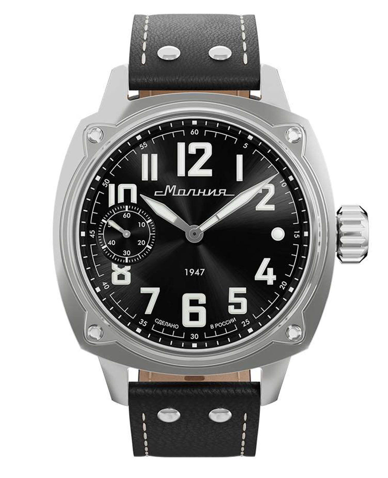 Мужские механические часы с ручным подзаводом — это аксессуар от легендарного бренда «МОЛНИЯ», созданный на Челябинском часовом заводе. Корпус диаметром 42 мм выполнен из нержавеющей стали 316L с зеркальной полировкой. БезельБезельВнешний ободок, закрепляющий стекло. В спортивных часах так называется поворотное кольцо с делениями на циферблате, выполняет роль таймера – замеряет отрезки времени на шкале. Неподвижный безель – элемент декора. Однонаправленно вращающийся безель на дайверских часах позволяет фиксировать моменты погружения и выныривания на поверхность. также выполнен из стали с зеркальной отделкой. Циферблат чёрного цвета оформлен индексами и стрелками. Малая секундная стрелка вынесена на позицию 9 часов. Стрелки и метки с люминесцентным покрытиемЛюминесцентное покрытиеПозволяет считывать показания времени в темноте. Производители наносят на стрелки, часовые индексы, безель или поверхность циферблата светонакопительный состав, дающий холодное свечение. Super-LumiNova, обеспечивающим хорошую читаемость в темноте. Циферблат защищён сапфировым стекломСапфировое стеклоПрочный и надёжный материал из кристалла сапфира синтетического происхождения, характеризующийся особой твёрдостью и устойчивостью к царапинам и повреждениям. с антибликовым покрытиемАнтибликовое покрытиеСлой оксида металла в 0,13-0,3 микрон, благодаря которому стекло часов не бликует и не отражает свет. Антибликовое покрытие уменьшает отражение света в 10 раз, обеспечивая отличную читаемость показателей циферблата.. Механизм — мануфактурный калибр 3603, собранный вручную, с запасом хода до 40 часов. Прозрачная задняя крышка позволяет наблюдать за работой механизма. Часы оснащены кожаным ремешком чёрного цвета с белой отстрочкой и классической пряжкой. Водонепроницаемость 100 м позволяет использовать часы для плавания и повседневного ношения. Идеальный выбор для тех, кто ценит российское качество и традиции.
