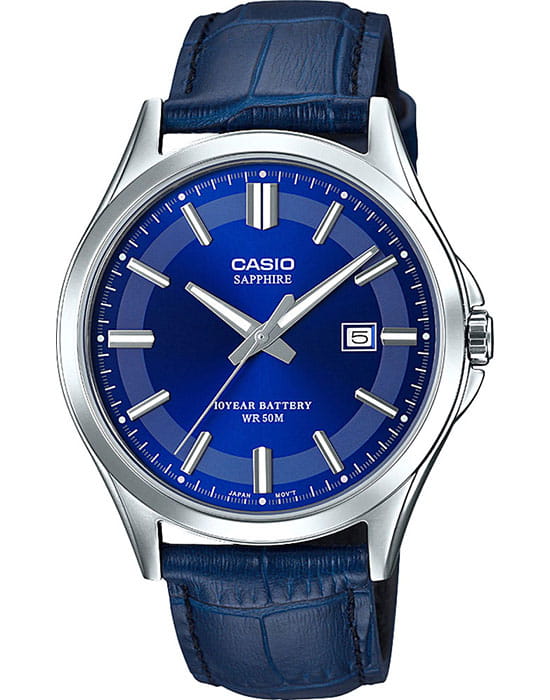 Наручные часы ярко-синего цвета идеальны для ежедневной носки, классический стиль делает их универсальной моделью. Главная особенность заключается в продолжительном сроке службы батарейки, питающей кварцевый механизм - аккумулятор рассчитан на 10 лет эксплуатации. Корпус сделан из хирургической стали 316L, материал устойчив к коррозии. Сапфировое стекло невозможно поцарапать. Люминесцентная подсветкаЛюминесцентное покрытиеПозволяет считывать показания времени в темноте. Производители наносят на стрелки, часовые индексы, безель или поверхность циферблата светонакопительный состав, дающий холодное свечение.. Водонепроницаемость 5 бар. Ремешок из натуральной кожи. Окошко текущего числа. Габариты: 47 x 41,3 x 8,8 мм.