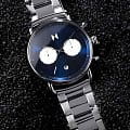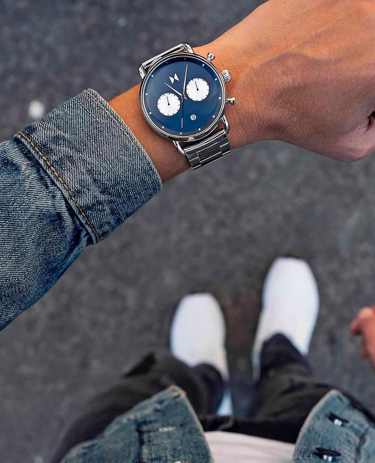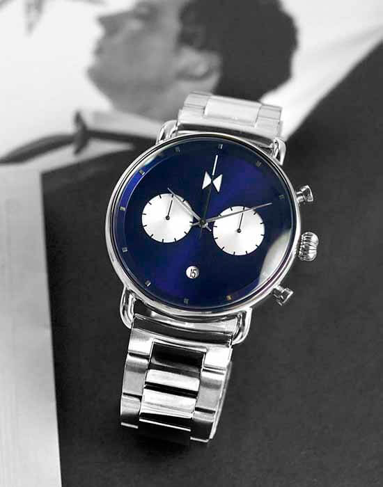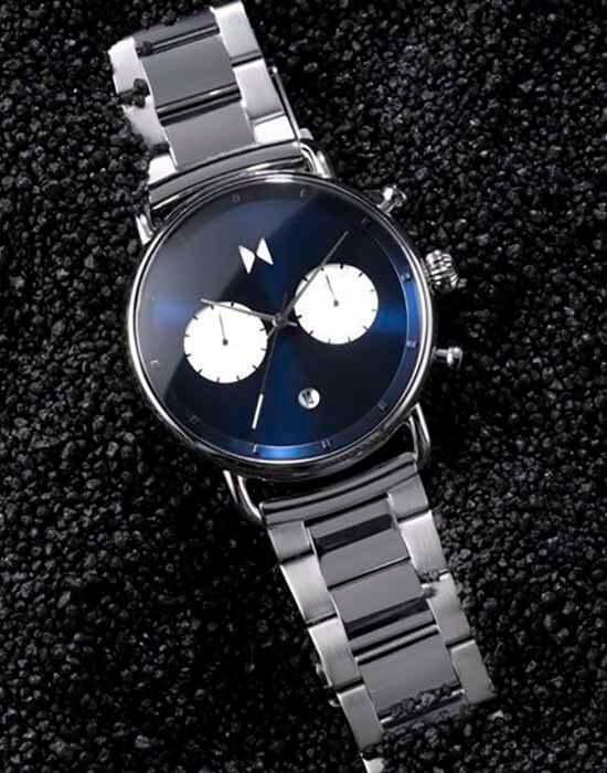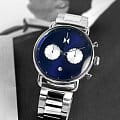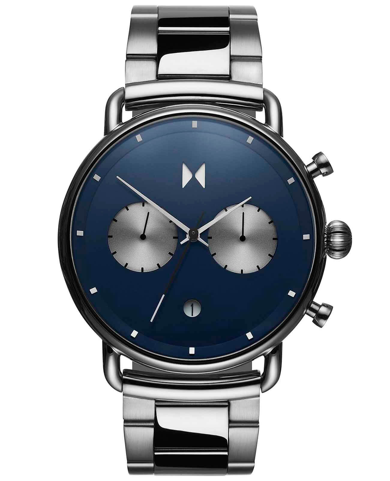 Мужские кварцевые часы-хронографХронографФункция позволяет измерять отрезки времени с особой точностью: часы, минуты, секунды. Верным признаком хронографа является наличие на циферблате 3 дополнительных окошек-счётчиков. с секундомеромСекундомерСекундоме́р — прибор, способный измерять интервалы времени с точностью до долей секунды. MVMT D-BT01-BLUS – лаконичная красота и изысканная элегантность. Оригинальная модель с классическим оформлением станет превосходным завершением образа, наделив его индивидуальным характером. Корпус выполнен из нержавеющей стали серебристого цвета, диаметром 47 мм и толщиной 13,5 мм, что обеспечивает долговечность и надежность. Закаленное минеральное стеклоМинеральное стеклоМинеральное стекло представляет собой искусственно выращенный минерал кварца. Такое стекло отличается особой устойчивостью к повреждениям и царапинам. Уступает по некоторым качествам сапфировому стеклу. защищает циферблат от царапин. Стальной браслет на раскладной застёжке с фиксаторомРаскладная застёжкаТакой тип застёжки используется только на браслетах из металла. Она никогда не раскрывается полностью, происходит разделение на 2 и более частей. Раскладывающая застёжка снизит вероятность потери часов к минимуму. обеспечивает комфортное ношение. Водозащита 100 метров позволит плавать, нырять и заниматься другими водными видами спорта. Рифленая заводная головка с защитой. Это аксессуар для мужчины, который ценит классический стиль и функциональность.