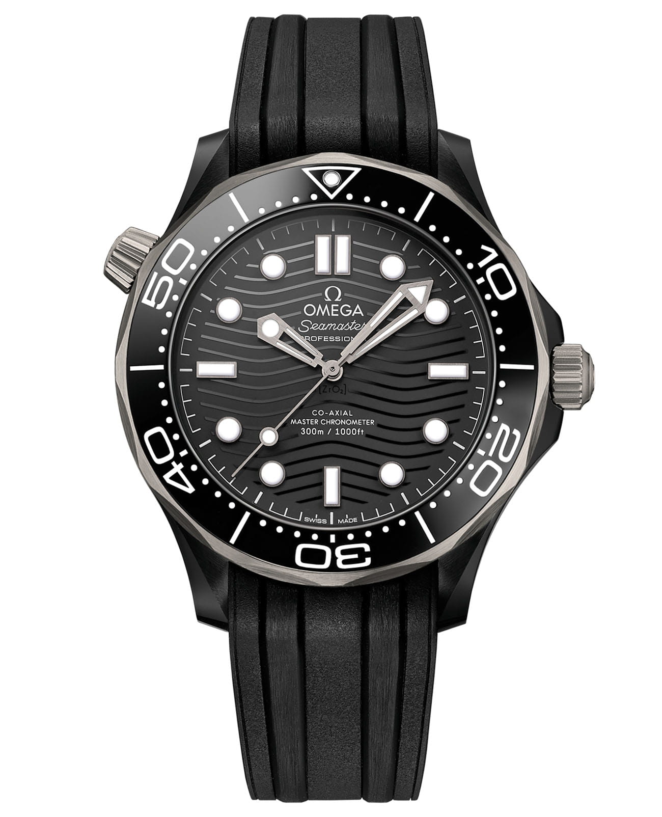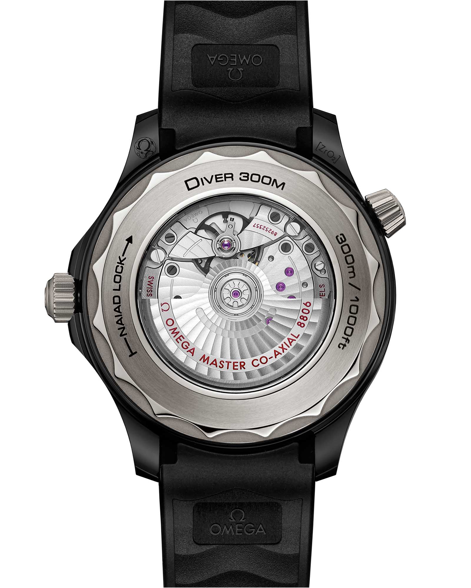 Часы Seamaster Professional Diver 300M, появившиеся на свет в 1993 году, привлекли внимание огромного количества ценителей часового искусства. Нынешняя коллекция вобрала в себя знаменитое океанское наследие, привнеся в него лучшие инновации и дизайнерские решения OMEGA. Эта модель диаметром 43,5 мм в корпусе из черной керамики и титана Grade 5 имеет черный керамический безельБезельВнешний ободок, закрепляющий стекло. В спортивных часах так называется поворотное кольцо с делениями на циферблате, выполняет роль таймера – замеряет отрезки времени на шкале. Неподвижный безель – элемент декора. Однонаправленно вращающийся безель на дайверских часах позволяет фиксировать моменты погружения и выныривания на поверхность. с дайверской шкалой из белой эмали. На циферблате из матовой черной керамики [ZrO2] лазером выгравирован волнообразный узор. Скелетонизированные стрелки и выпуклые индексы с титановым PVD-покрытиемPVDУльтратонкое покрытие наносится в технике вакуумного напыления, сочетает в себе нитрид титана особой прочности со слоем золота или оксида хрома. Несёт в себе декоративную или защитную функцию. имеют углубления, заполненные белым люминесцентным составомЛюминесцентное покрытиеПозволяет считывать показания времени в темноте. Производители наносят на стрелки, часовые индексы, безель или поверхность циферблата светонакопительный состав, дающий холодное свечение. Super-LumiNova, а гелиевому клапану придана коническая форма. Часы дополнены интегрированным черным каучуковым ремешком с застежкой из черной керамики [ZrO2] с полированными и матовыми поверхностями и оснащены калибром OMEGA Master Chronometer 8806, который виден сквозь сапфировое стеклоСапфировое стеклоПрочный и надёжный материал из кристалла сапфира синтетического происхождения, характеризующийся особой твёрдостью и устойчивостью к царапинам и повреждениям. задней крышки с волнистым краем.
