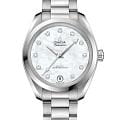 Omega Seamaster Aqua Terra выполнены в симметричном корпусе из нержавеющей стали с завинчивающейся задней крышкой, украшенной волновым узором. Циферблат дополнен окошком даты на 6 часах и 11 бриллиантами, установленными в родиевые держатели — деталь, подчёркивающая женственность и роскошь модели. Циферблат изготовлен из перламутрового материала с переливающейся текстурой, а стрелки и метки выполнены из белого золота. Калибр Omega 8800 сертифицирован как Master Chronometer — гарантия высочайшей точности и устойчивости к магнитным полям. Запас хода составляет 55 часов. Защиту циферблата обеспечивает сапфировое стеклоСапфировое стеклоПрочный и надёжный материал из кристалла сапфира синтетического происхождения, характеризующийся особой твёрдостью и устойчивостью к царапинам и повреждениям. с антибликовым покрытиемАнтибликовое покрытиеСлой оксида металла в 0,13-0,3 микрон, благодаря которому стекло часов не бликует и не отражает свет. Антибликовое покрытие уменьшает отражение света в 10 раз, обеспечивая отличную читаемость показателей циферблата. с обеих сторон. Водозащита позволяет использовать часы в воде без риска повреждения. Часы установлены на интегрированный стальной браслет. Это сочетание премиального качества, технологичности и классического дизайна.