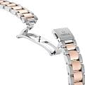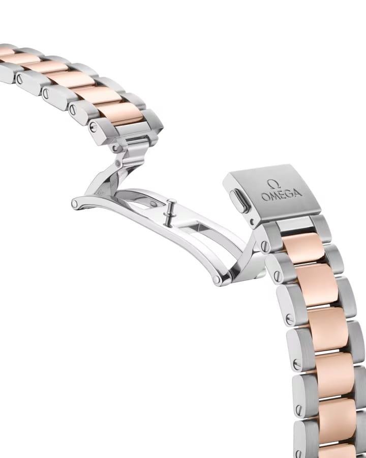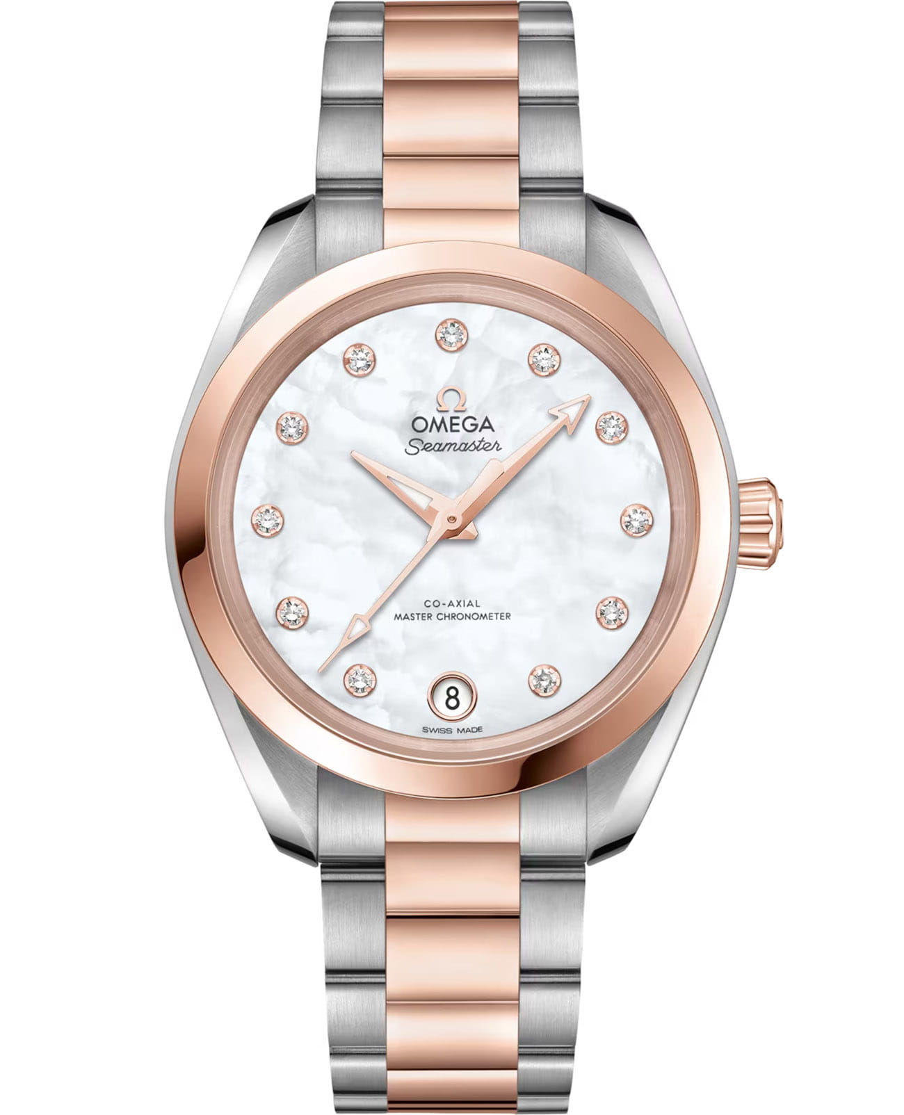 Omega Seamaster Aqua Terra выполнены в симметричном корпусе из нержавеющей стали и 18K Sedna™ золота с завинчивающейся задней крышкой, украшенной волновым узором. Циферблат дополнен окошком даты на 6 часах и 11 бриллиантами, установленными в держатели из 18K Sedna™ золота — деталь, подчёркивающая женственность и роскошь модели. Циферблат белого цвета изготовлен из перламутрового материала с переливающимся эффектом. Стрелки и метки выполнены из 18K Sedna™ золота. Калибр Omega 8800 сертифицирован как Master Chronometer — гарантия высочайшей точности и устойчивости к магнитным полям. Запас хода составляет 55 часов. Защиту циферблата обеспечивает сапфировое стеклоСапфировое стеклоПрочный и надёжный материал из кристалла сапфира синтетического происхождения, характеризующийся особой твёрдостью и устойчивостью к царапинам и повреждениям. с антибликовым покрытиемАнтибликовое покрытиеСлой оксида металла в 0,13-0,3 микрон, благодаря которому стекло часов не бликует и не отражает свет. Антибликовое покрытие уменьшает отражение света в 10 раз, обеспечивая отличную читаемость показателей циферблата. с обеих сторон. Водозащита позволяет использовать часы в воде без риска повреждения. Часы установлены на интегрированный браслет из стали и 18K Sedna™ золота с раскладной застёжкойРаскладная застёжкаТакой тип застёжки используется только на браслетах из металла. Она никогда не раскрывается полностью, происходит разделение на 2 и более частей. Раскладывающая застёжка снизит вероятность потери часов к минимуму.. Это сочетание премиального качества, технологичности и классического дизайна.